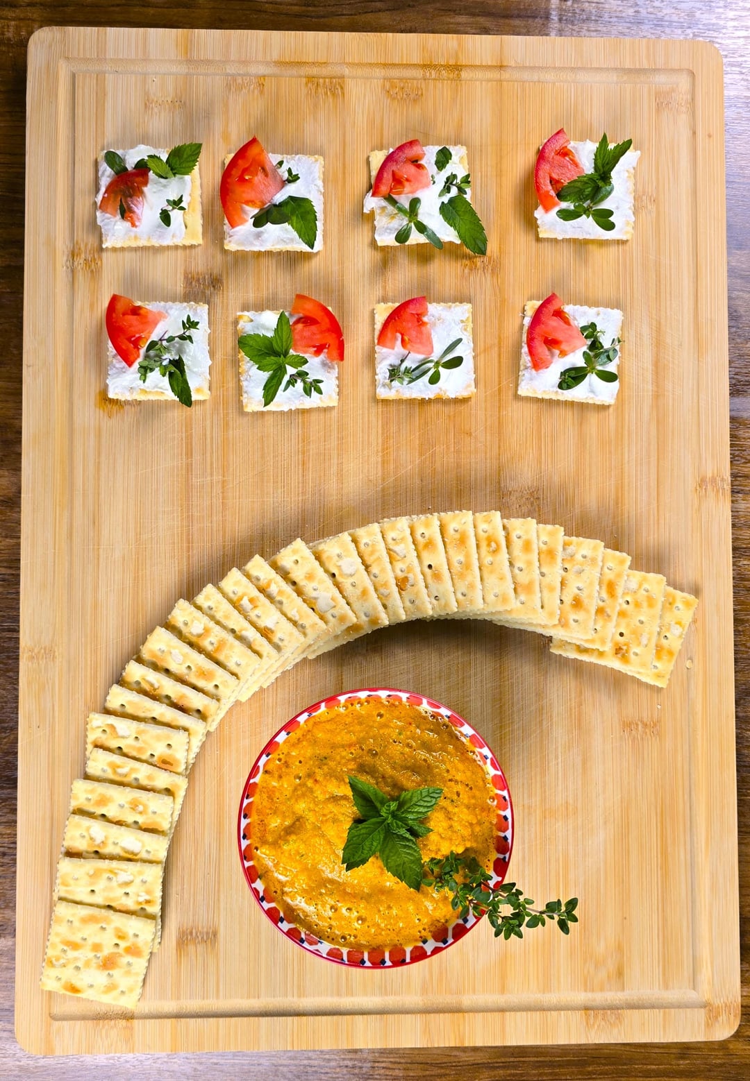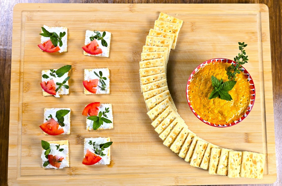 - Slice the mini cucumbers, tomato, sweet mini peppers, and yellow onion.