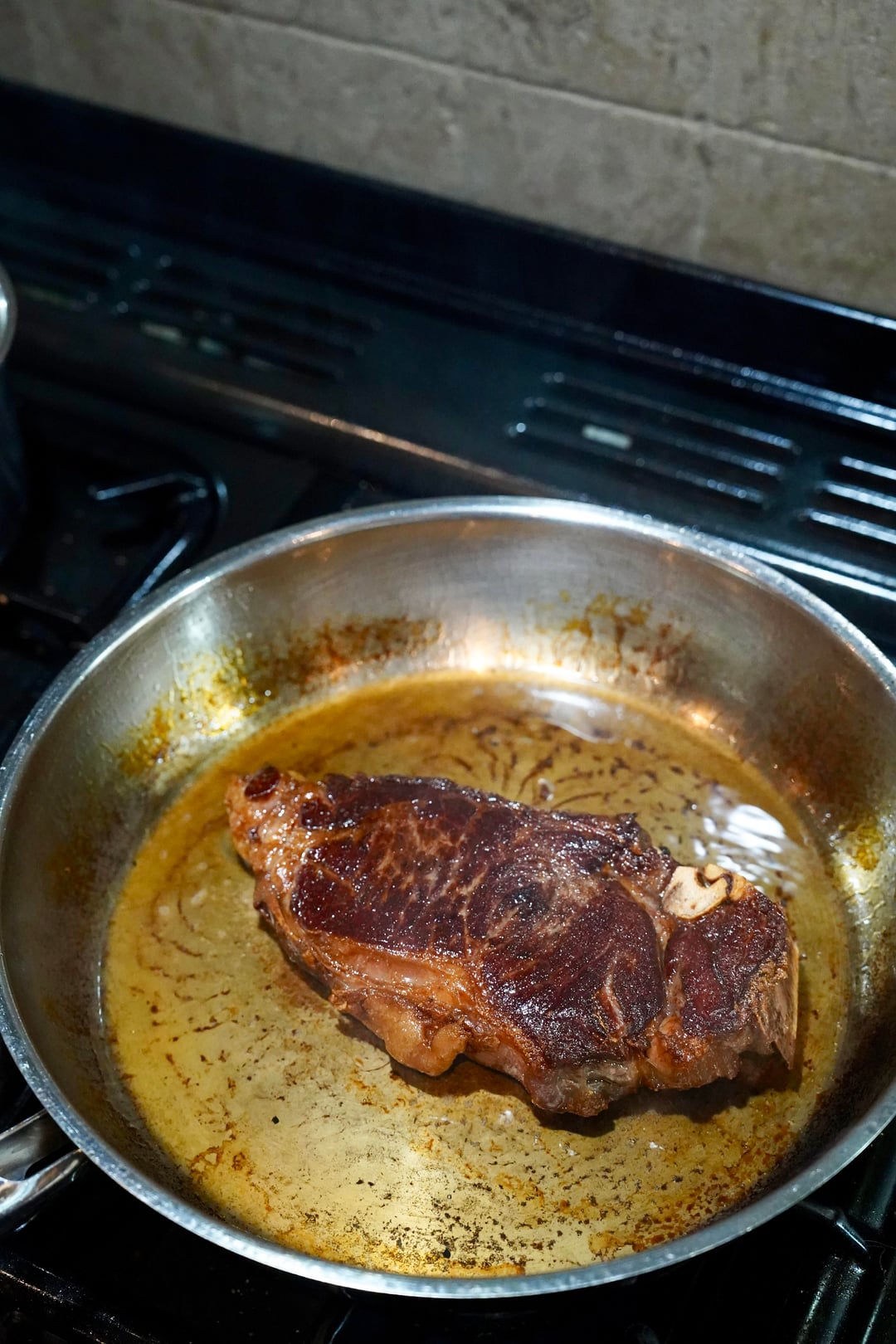 Tonight I roast a pretty decent piece of sirloin on the bone in stainless steel.