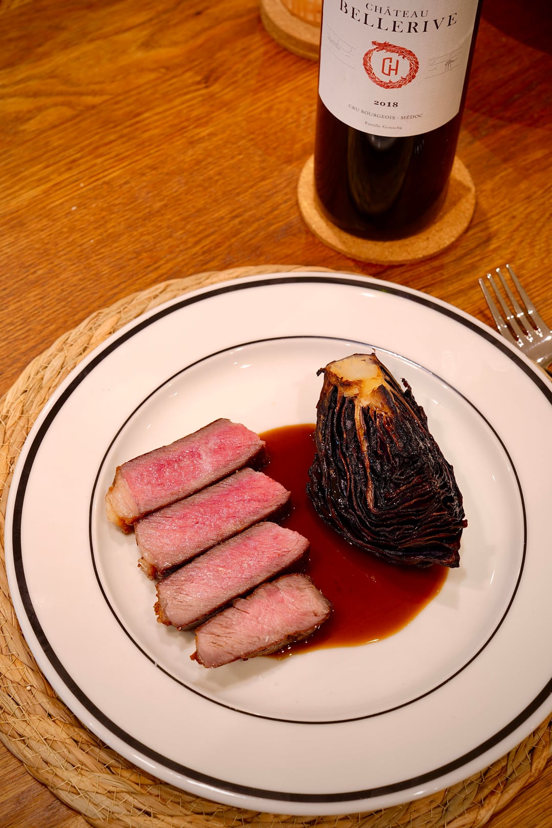 It should be five prices of steak, and another element or the cabbage cut into two to make three main elements