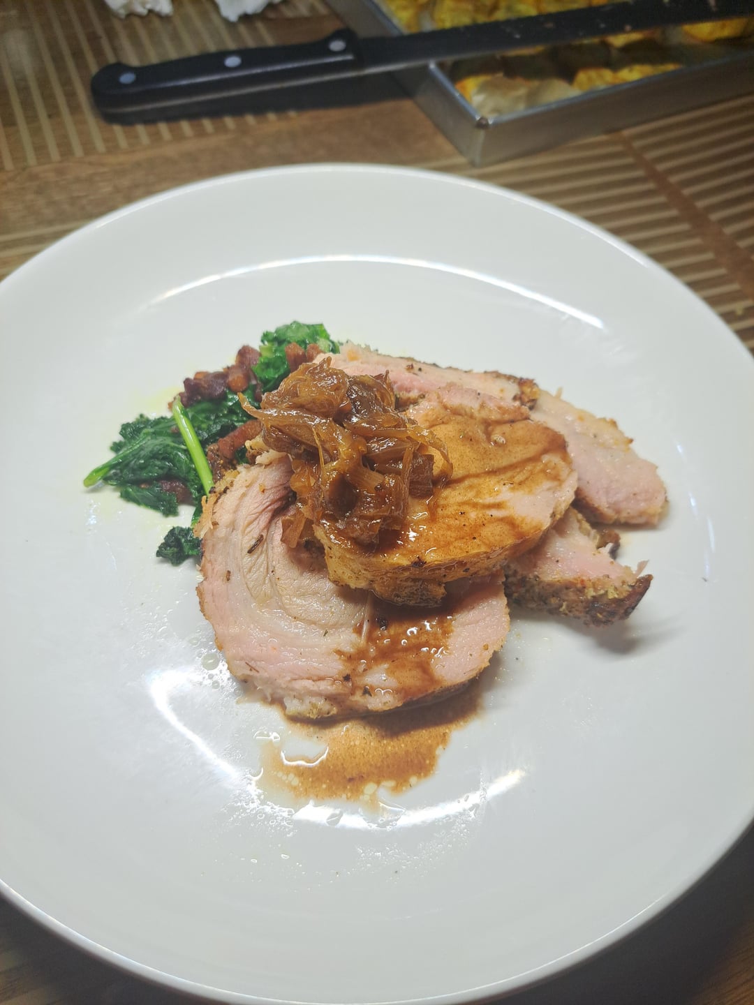 im not a pro, but how did i do? looking for constructive advice! this is a slow-roasted duroc pork belly with a red wine balsamic jus, caramelised onion, served on a bed of sauteed kale with crispy guanciale by Humiliated-Guava729 Culinary Culinary Plating