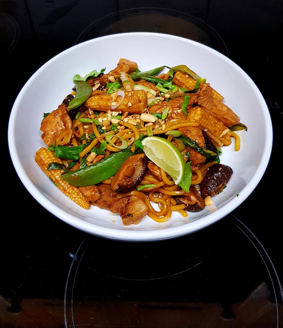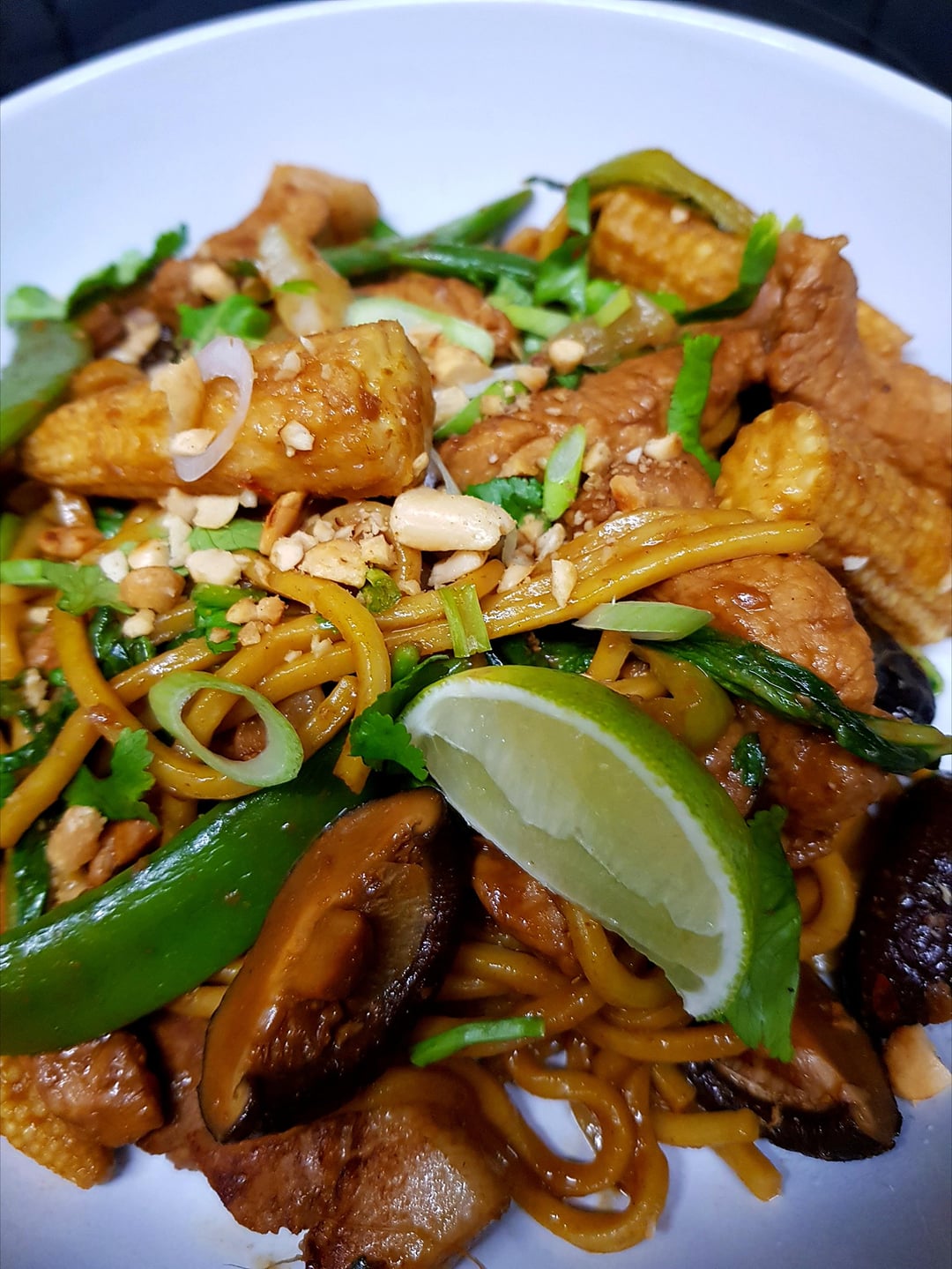 Pork Stir Fry. Pak Choi, Snap Peas, Baby Corn, Shiitake Mushrooms and Egg Noodles with Garlic, Chilli and Hoisin. Finished with Herbs and Nuts. by pink_flamingo2003 Dinner Tonight Tonight's Dinner