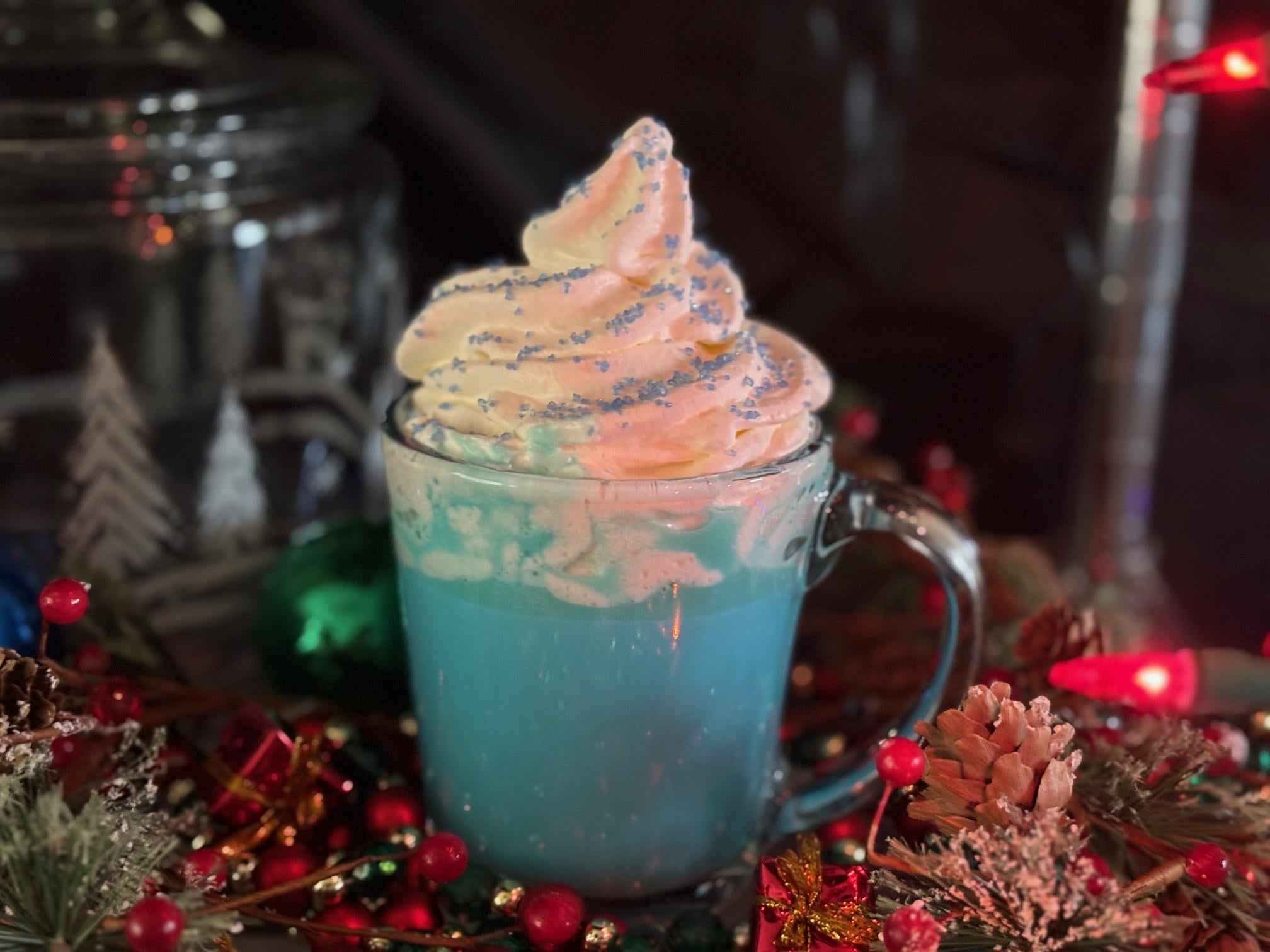 Made with white chocolate, whole milk, heavy cream, vanilla extract, salt, blue food coloring and topped with homemade whipped cream and blue sanding sugar. If you've never had white hot chocolate before it is in a league all by itself. Best hot chocolate ever.