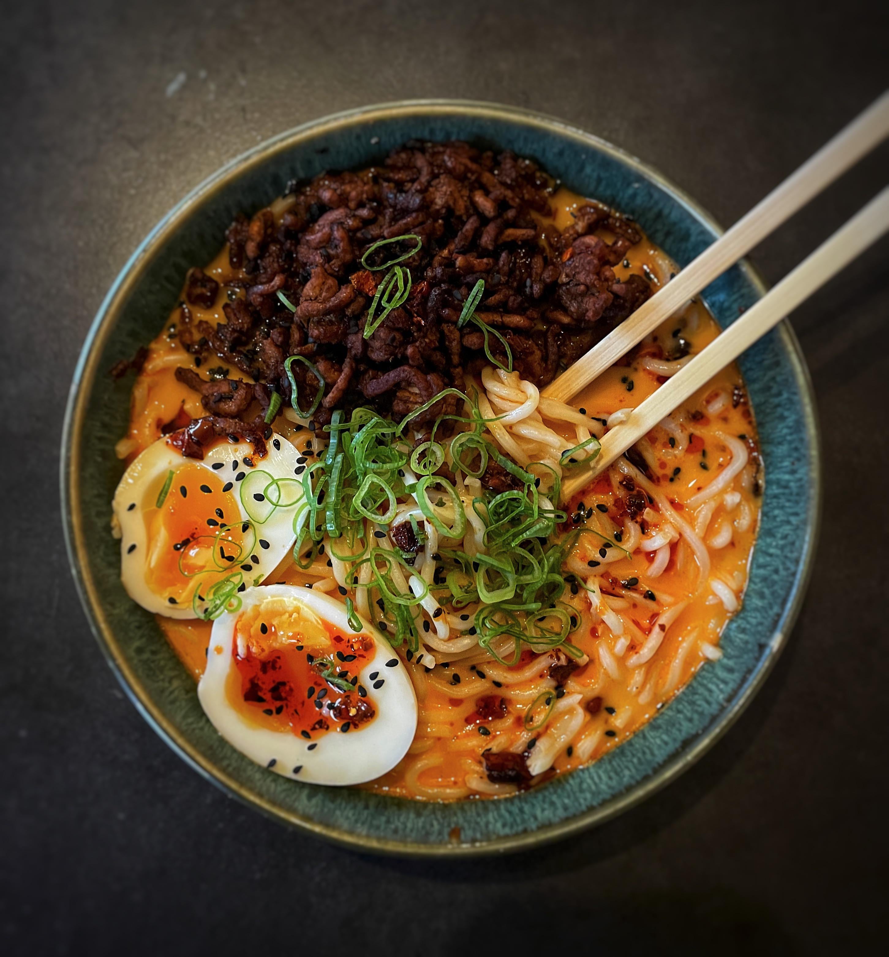 Chicken broth, kewpie mayo, egg yolk, Lao Gan Ma and Thai red curry paste, topped with fried ground pork, dark soy and chili, and a soft boiled egg