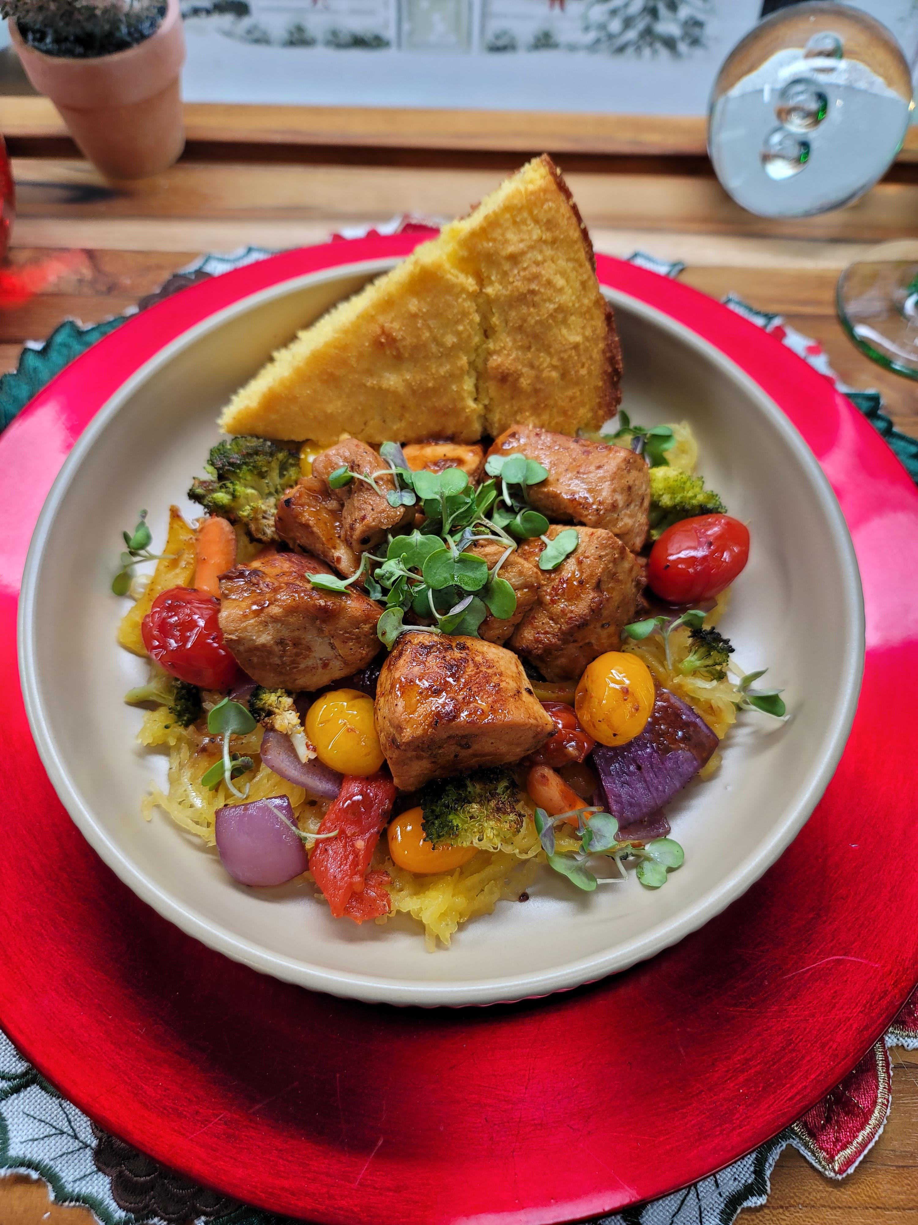 [Homemade]Garlic Butter Gochugaru Pork Bits w/ Roasted Vegetables and Corn Bread!!! by Inner-Sir-1214 Food Porn