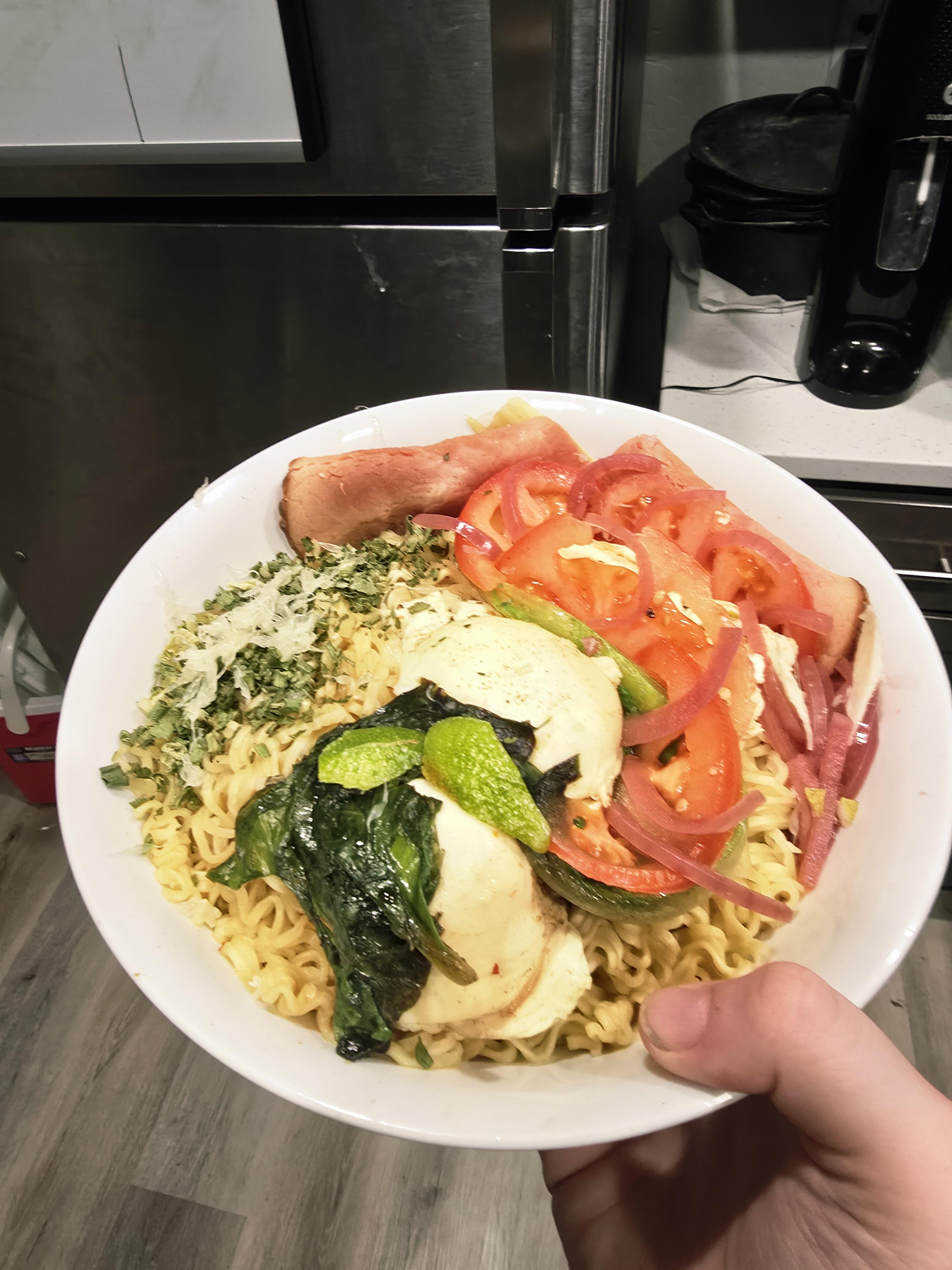 I'm not entirely sure if this belongs here, but here's a pic of my ramen before I poured in the broth. The only thing that significantly changed after the broth was the eyes, since they float. The pickled onions were a bit strong for the dish lol.