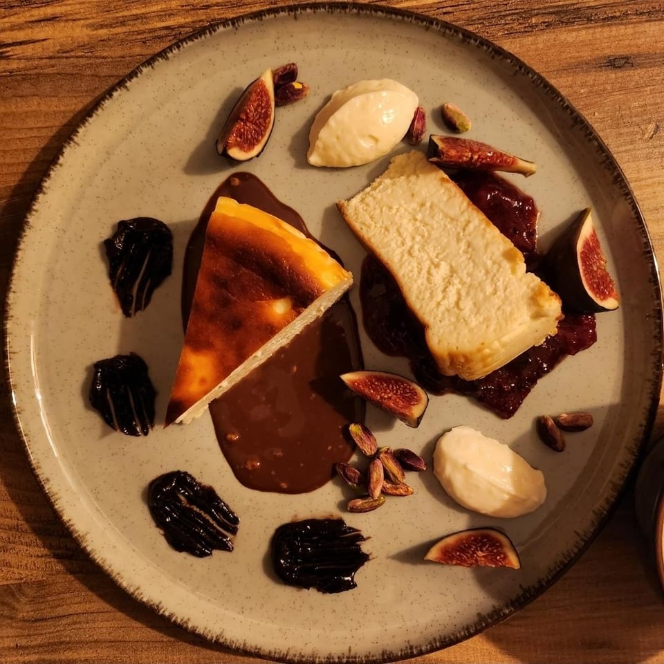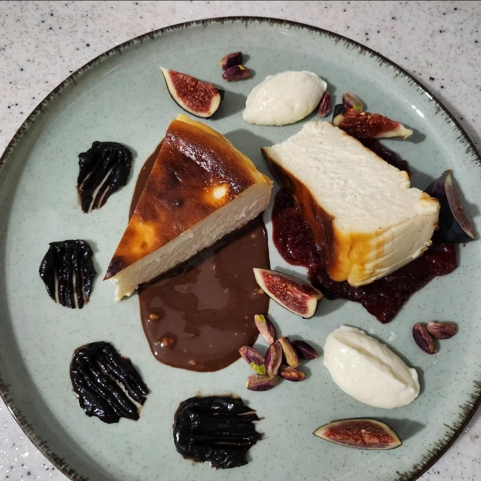 Homemade nutella, very ordinary Basque Cheesecake (san sebastian sounds better), chocolate ganache with sum nuts under the slice, strawberry basil jam under the right slice, figs & pistachios, HOMEMADE goat cheese vanilla ice cream which everyone in the house disliked, more for me.