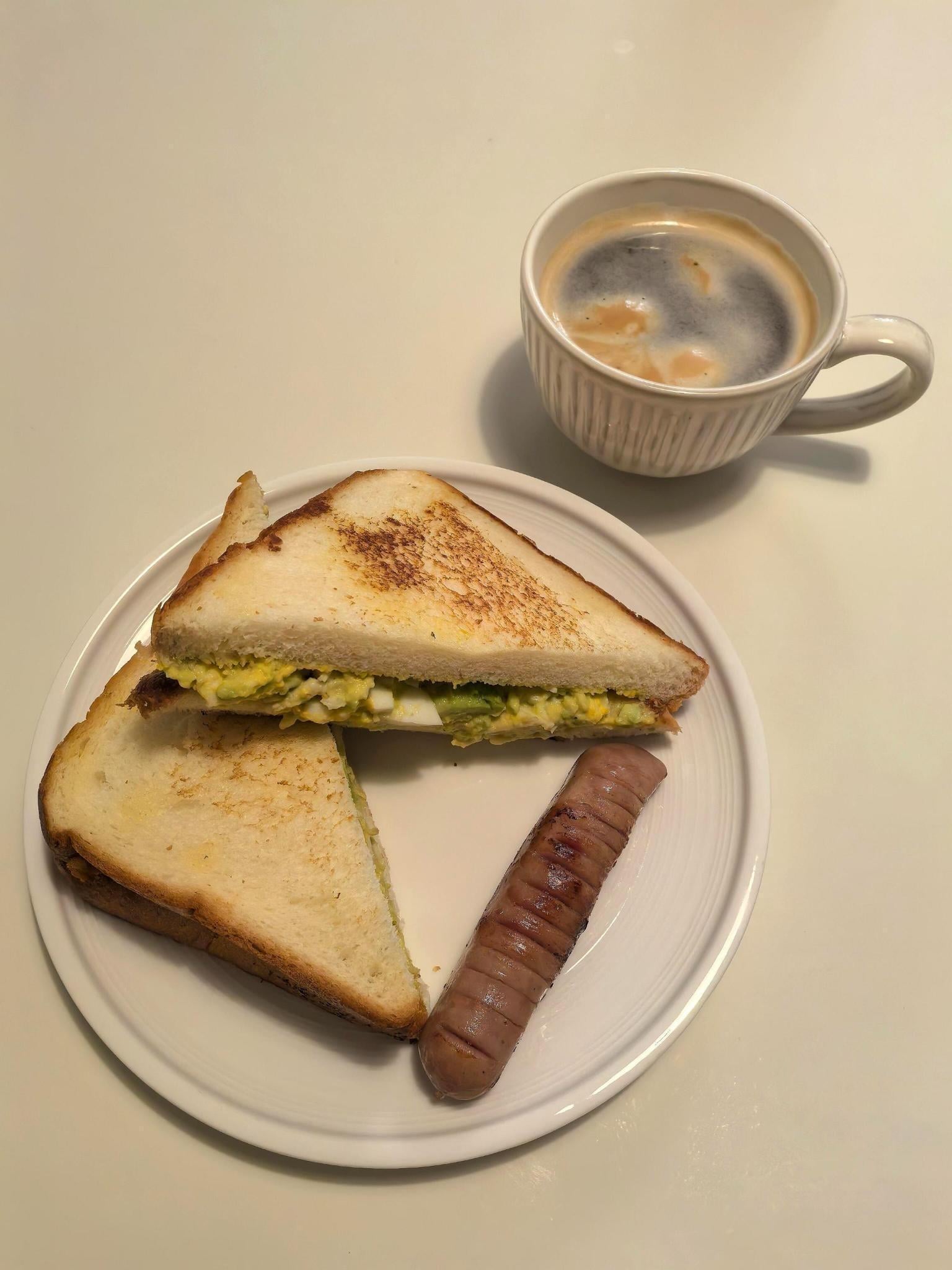 Toasted bread with avocado and egg, topped with a sausage, and a cup of hot coffee. by OverHoney9464 Food Porn