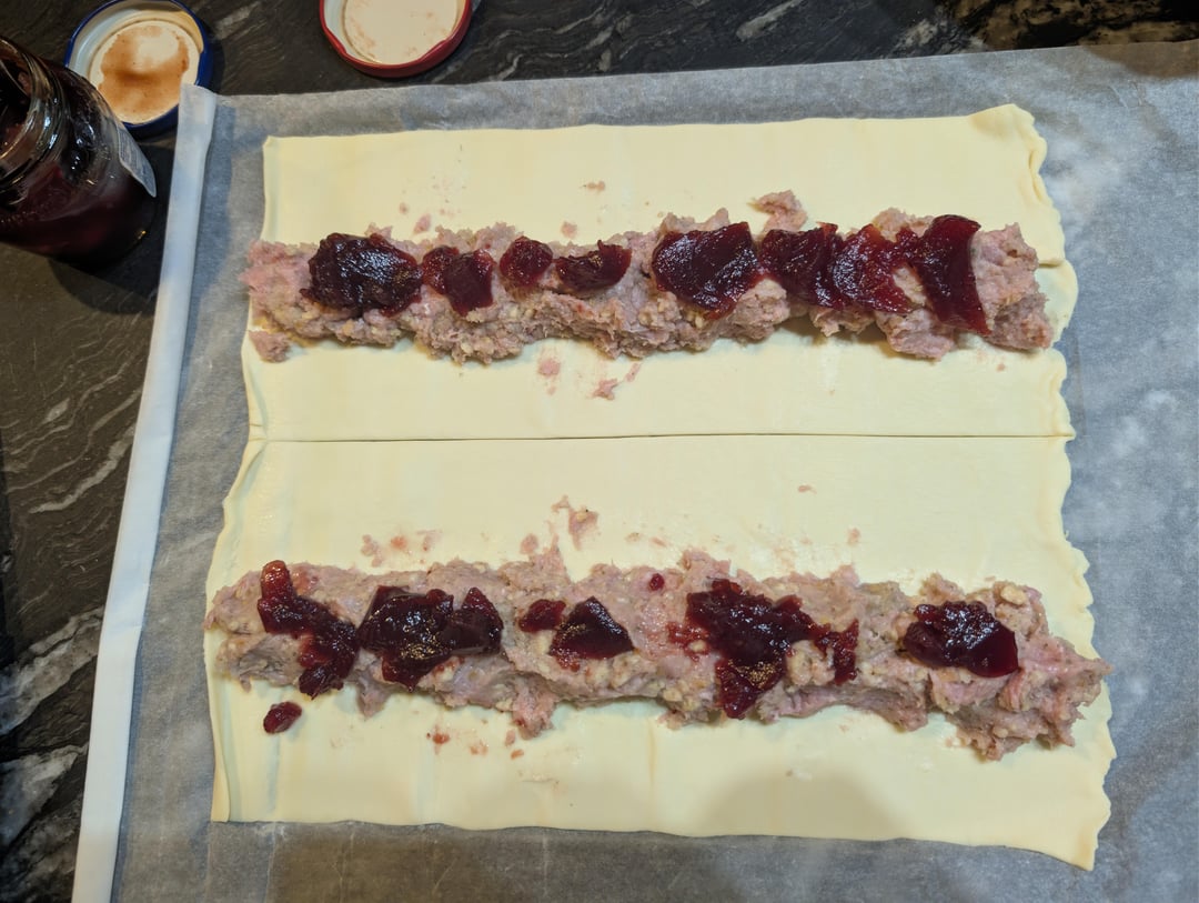 [Homemade] Sausage Rolls with Stuffing and Cranberry Sauce
