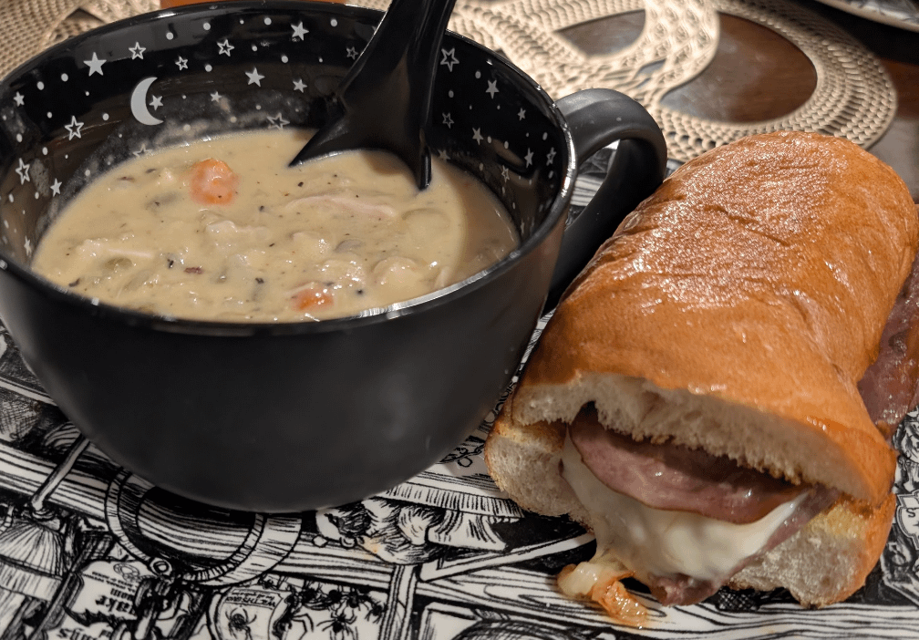 Roast beef and provolone served hot on a grilled baguette with balsamic onion jam, and a bowl of smoky chicken and wild rice soup by HHRose86 Food