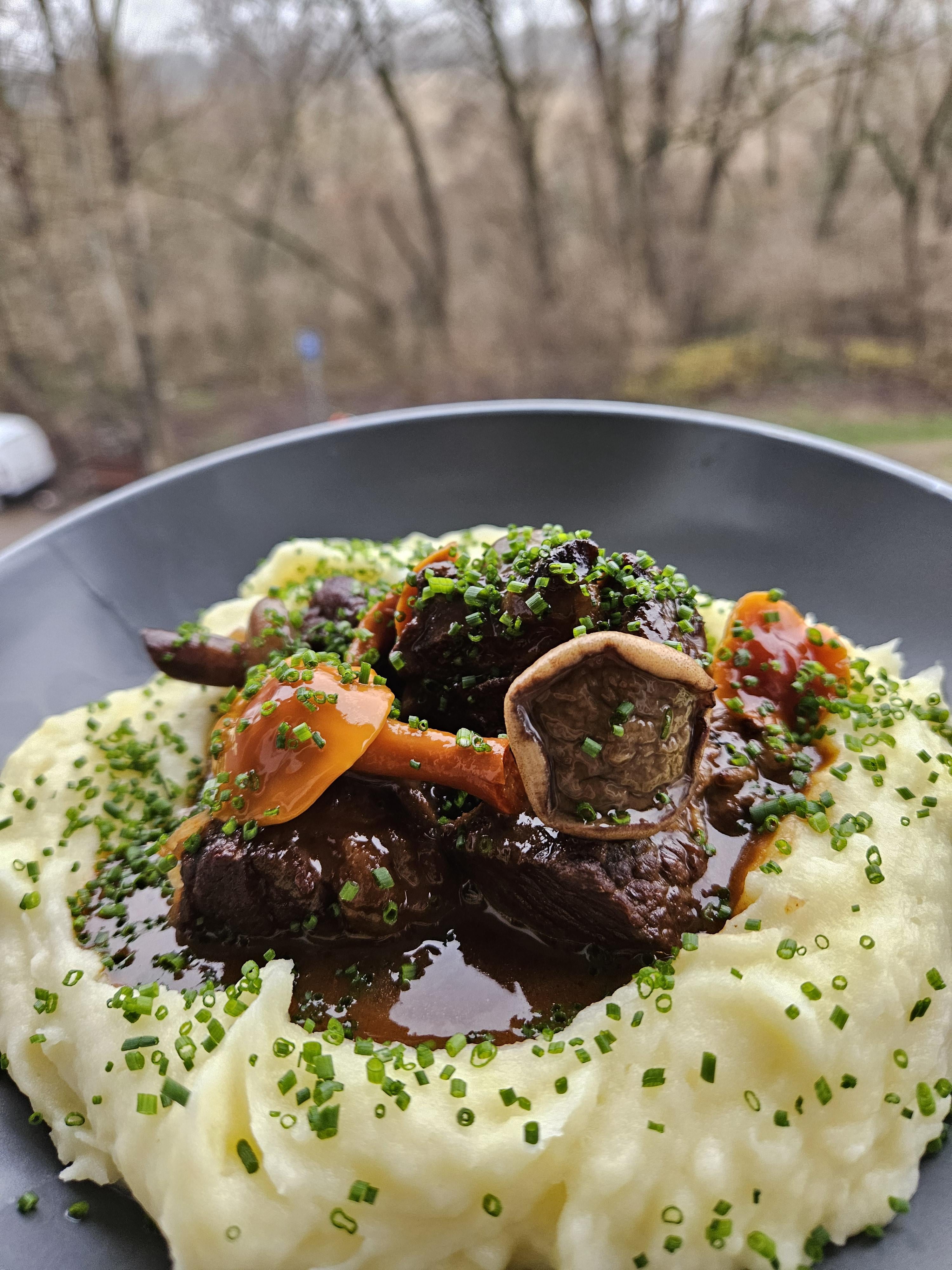 [homemade] beef stew, mashed potaoes and pickled mushrooms