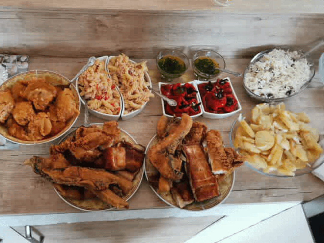 [homemade] Salmon and carp served with rice, potato salad, and pasta with tuna.