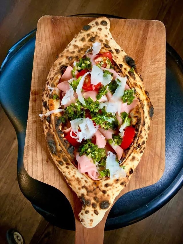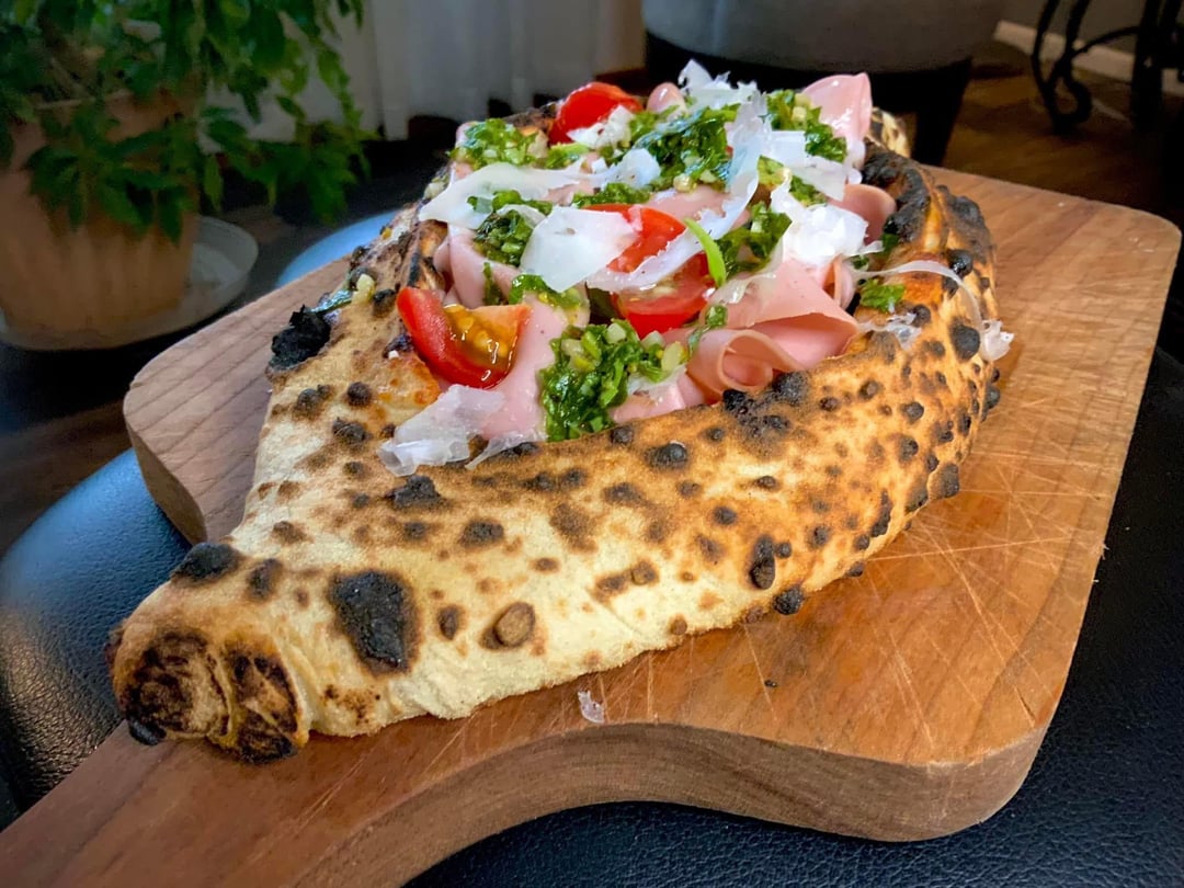 Baked with mozzarella, then filled with mortadella , tomatoes, purple onions, and topped with a pistachio pesto, and shaved Romano by RichardChrz Food