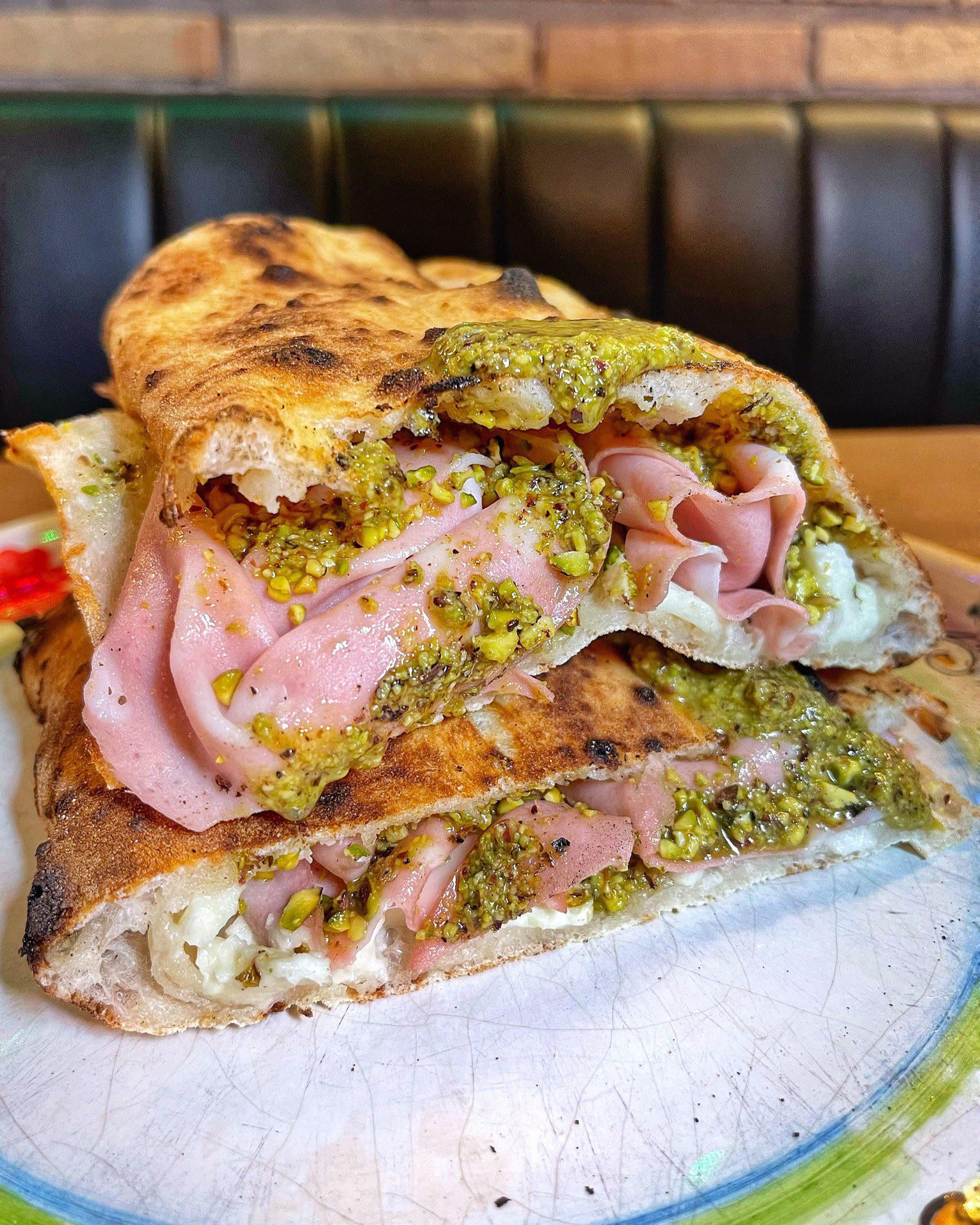 Mortadella, Pistacchio and Mozzarella Calzone.