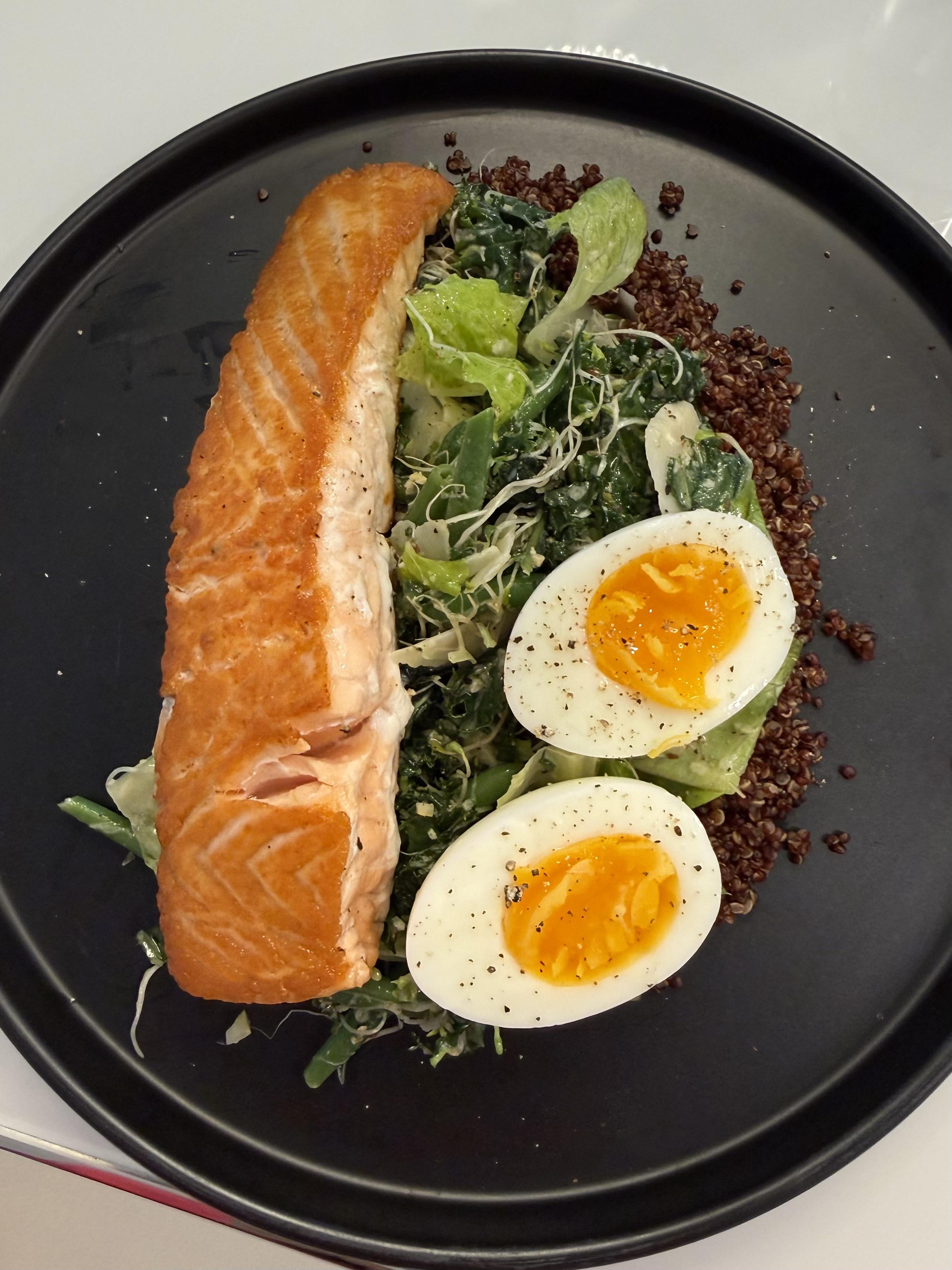 Kale and romaine salad with sprouts, green beans, red quinoa, salmon, egg, and a lemon dressing