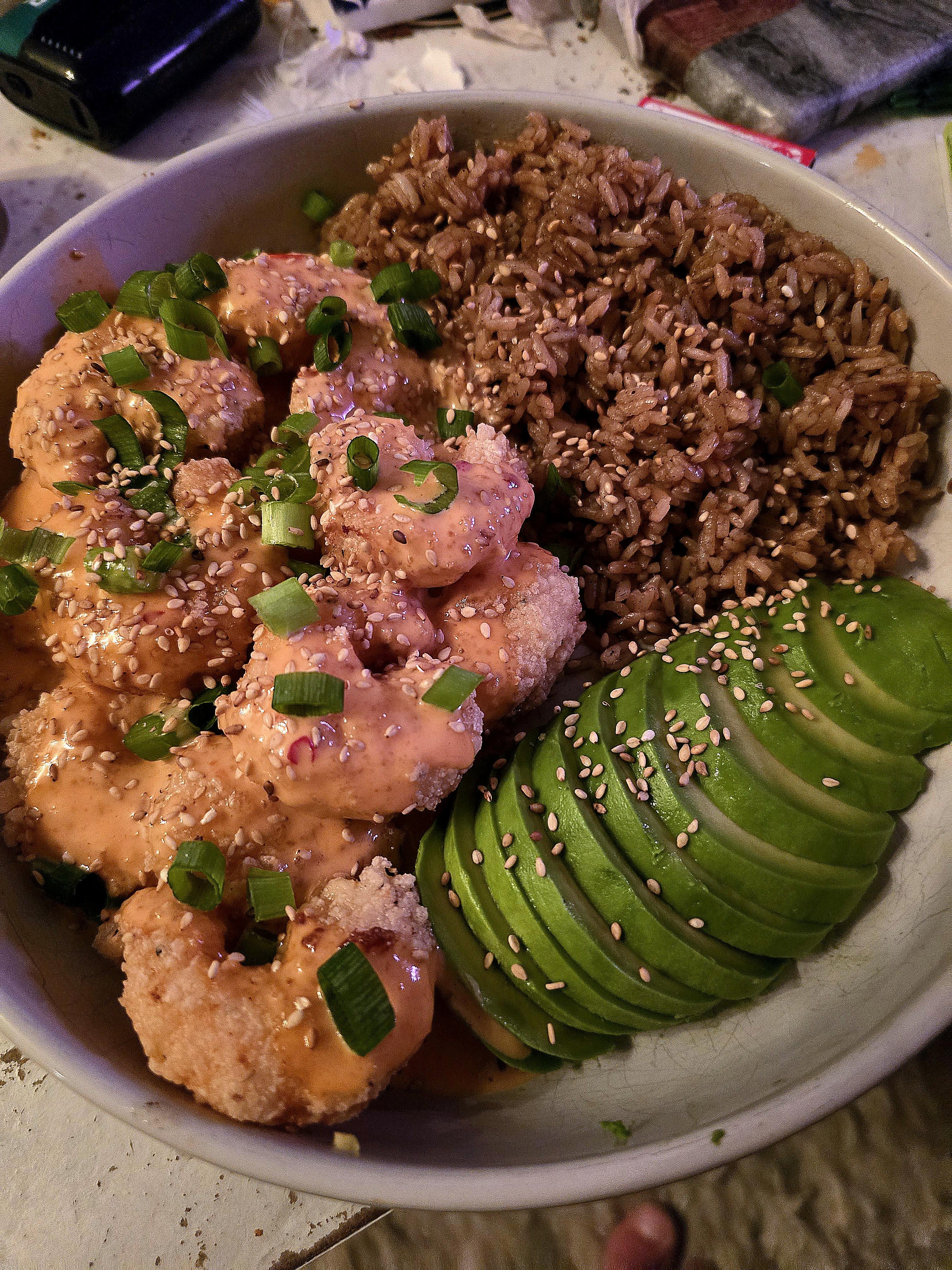 [Homemade] Bang Bang Shrimp with Black Garlic Rice.