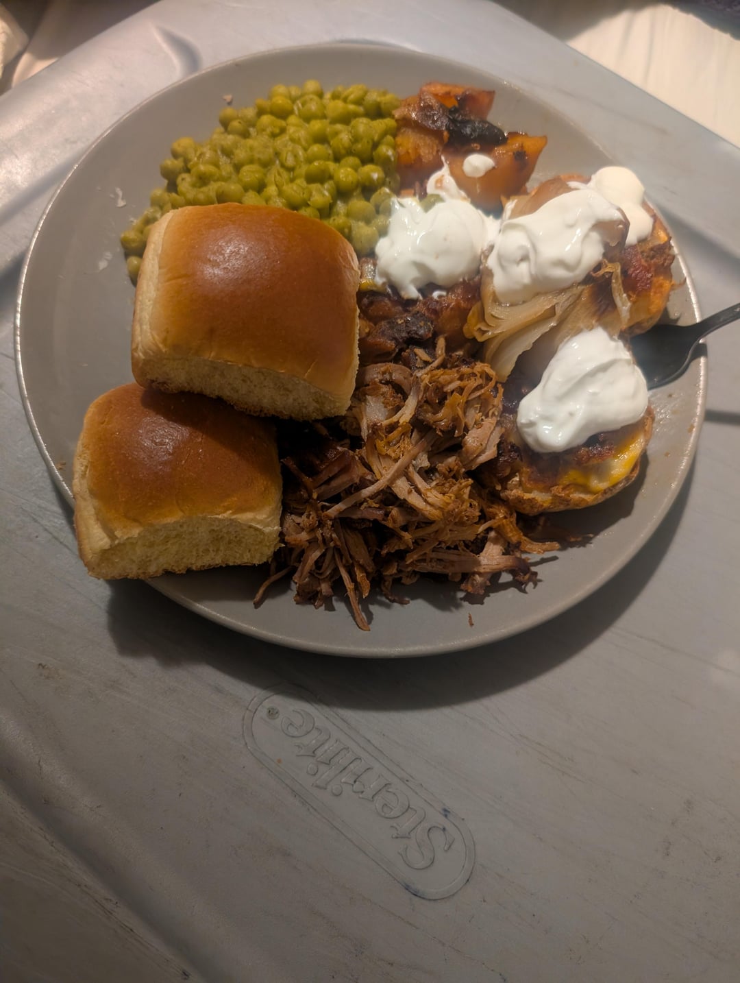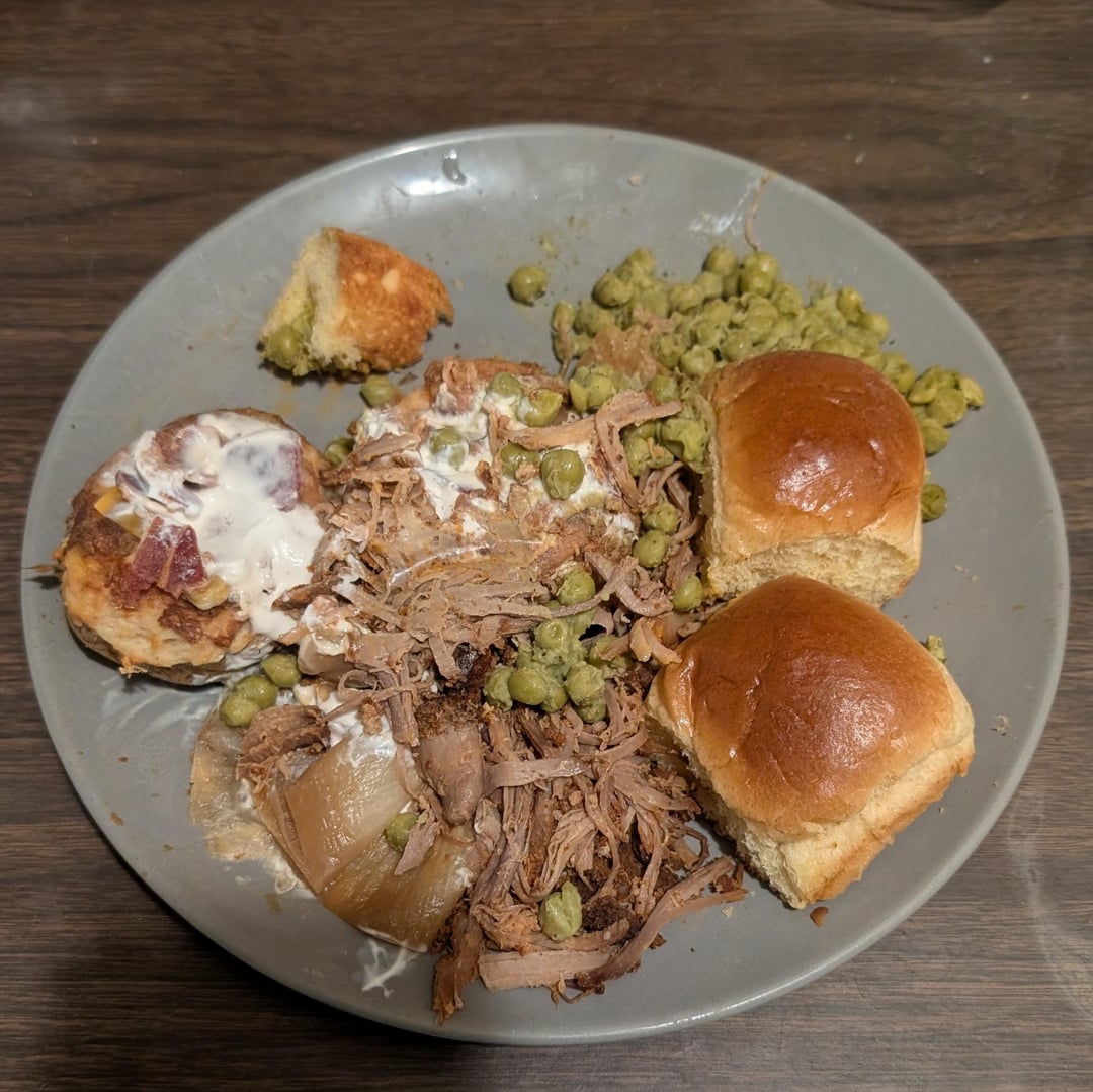 Last night’s plate minus a few bites is tonight’s plate because I taste-tested so much while cooking I wasn’t hungry at dinner time haha. BBQ pork roast, twice-baked potatoes, rolls, peas, and roasted veggies