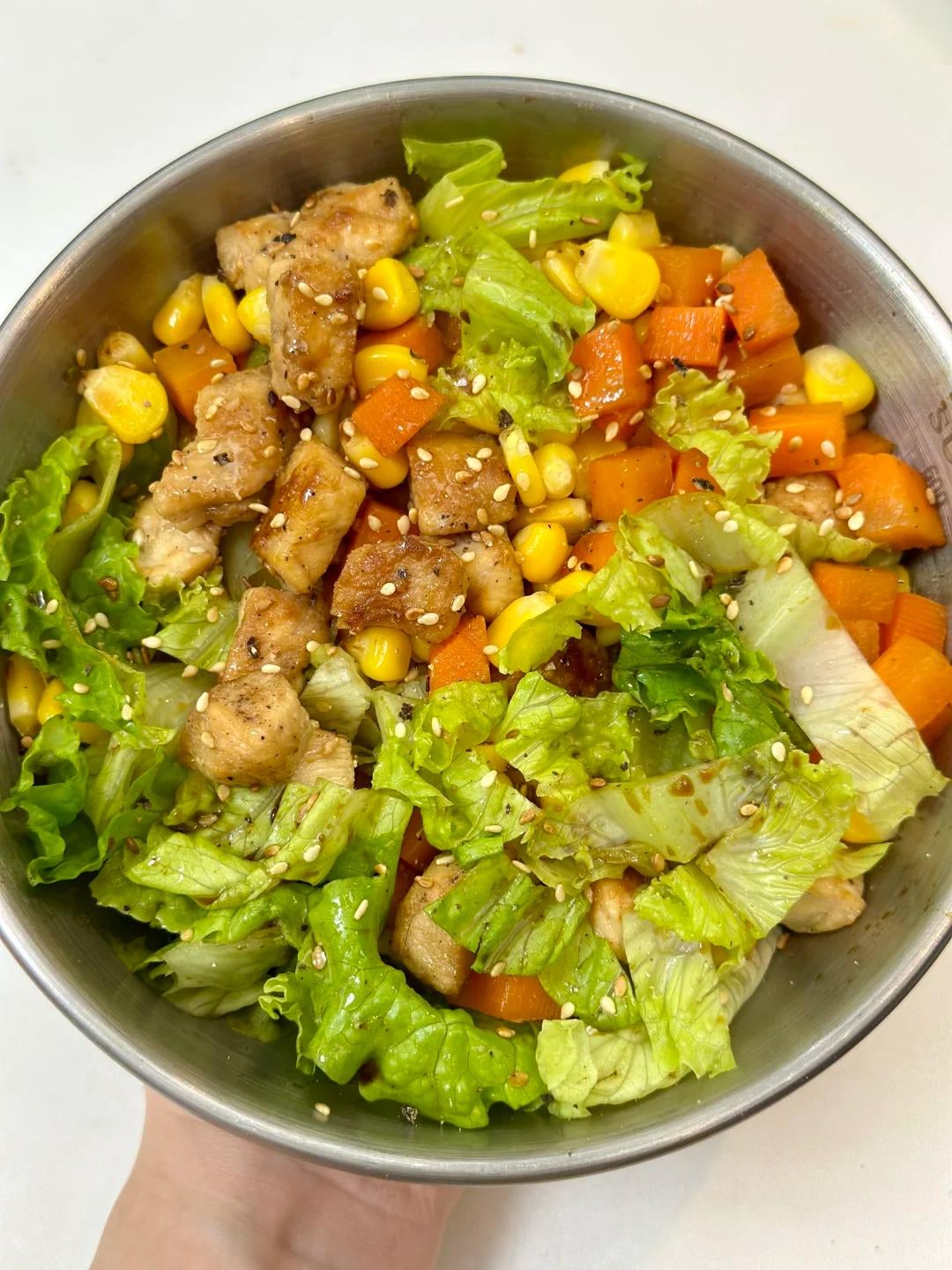 Homemade [OC] chicken bowl with corn, carrots, lettuce and sesame
