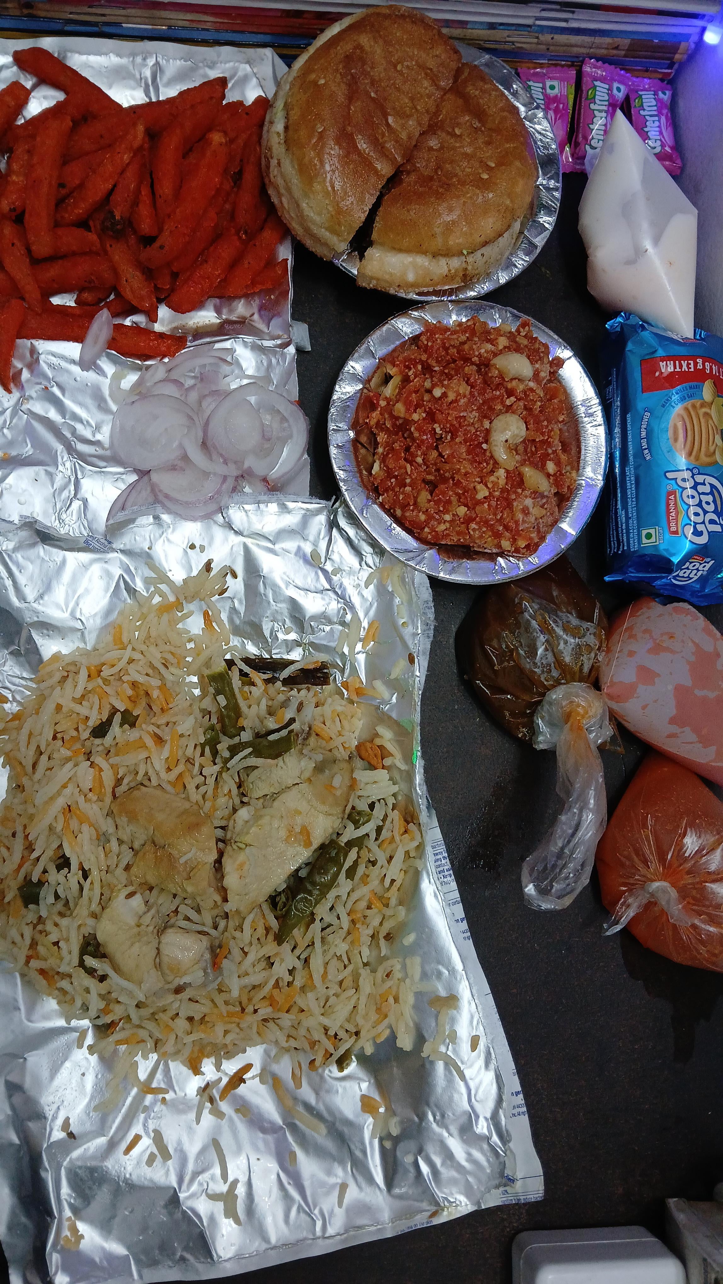 [I ate] Chilli chicken biryani with French fries & Carrot pudding, Street food spread, Indian style