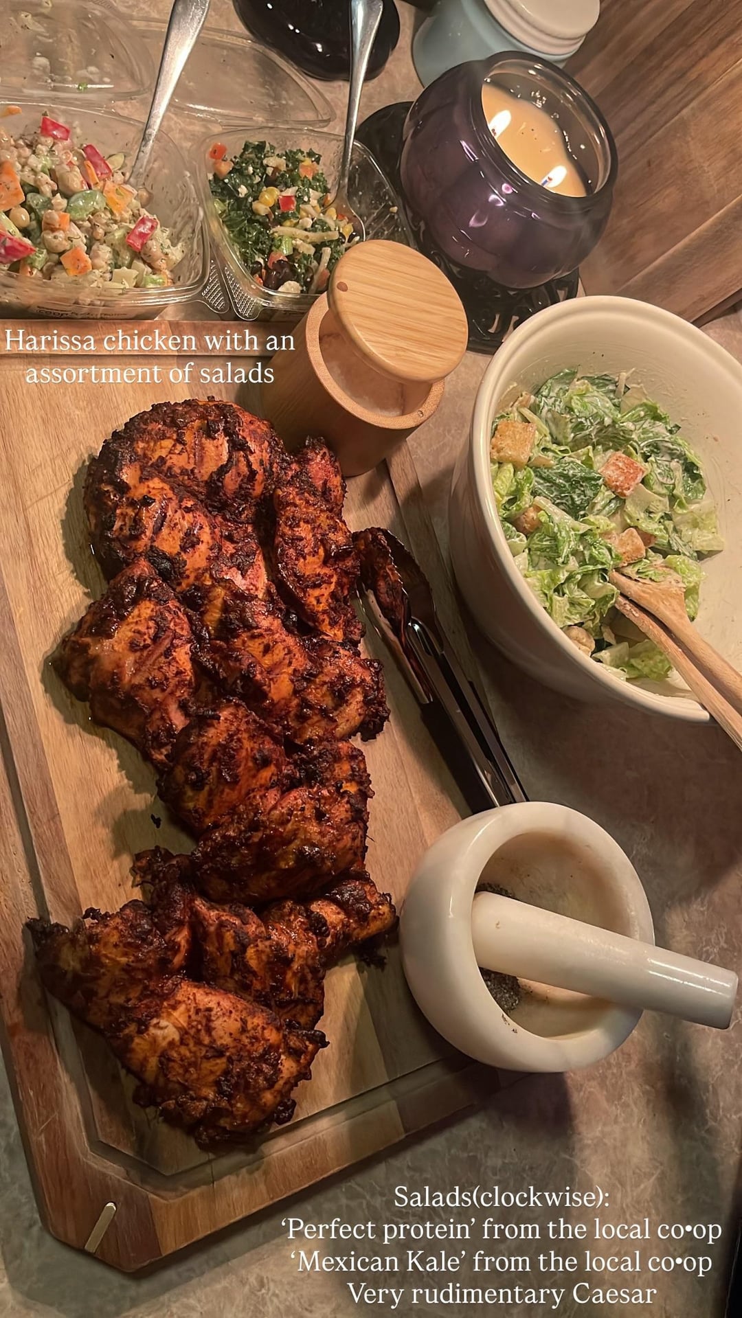 2. What is your recipe for the harissa? I had a North African ex who gave me a recipe but I have not ever been able to get mine 1:1 to hers. Mine is maybe 60-70% of hers when I make it but I mix in with some Greek yogurt and cook it on the grill indirect.