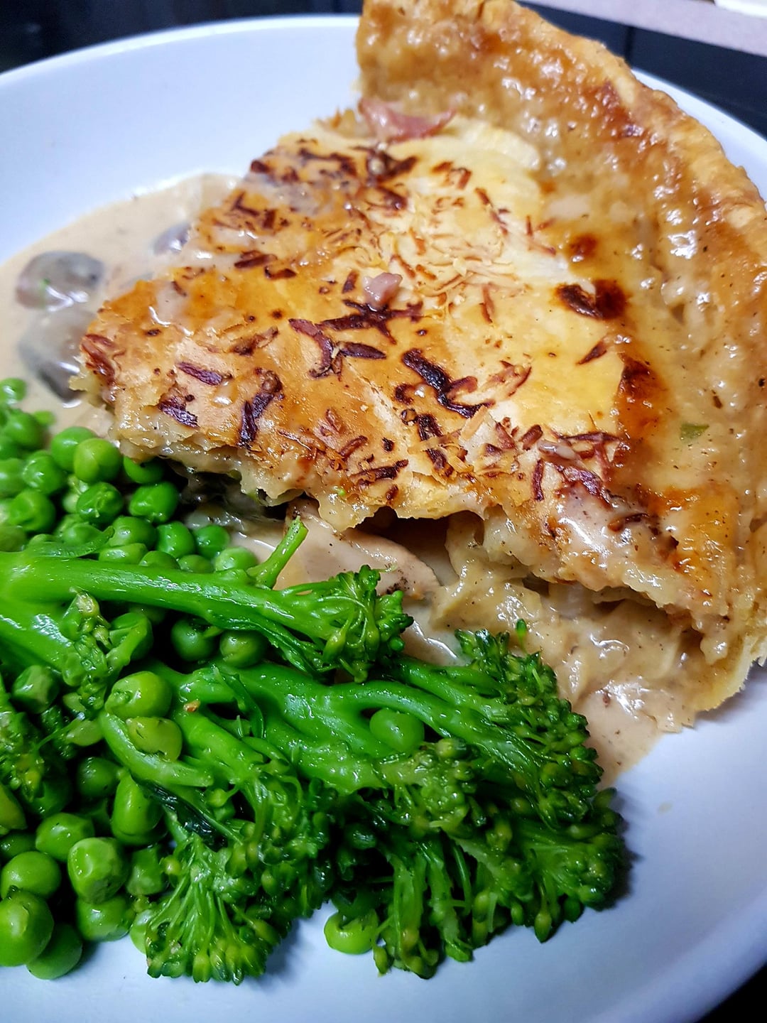 Chicken, Bacon and Mushroom Suet Pastry Pie with Brie and White Wine Sauce. Sautéed Tenderstem Brocolli and Peas. by pink_flamingo2003 Dinner Tonight Tonight's Dinner