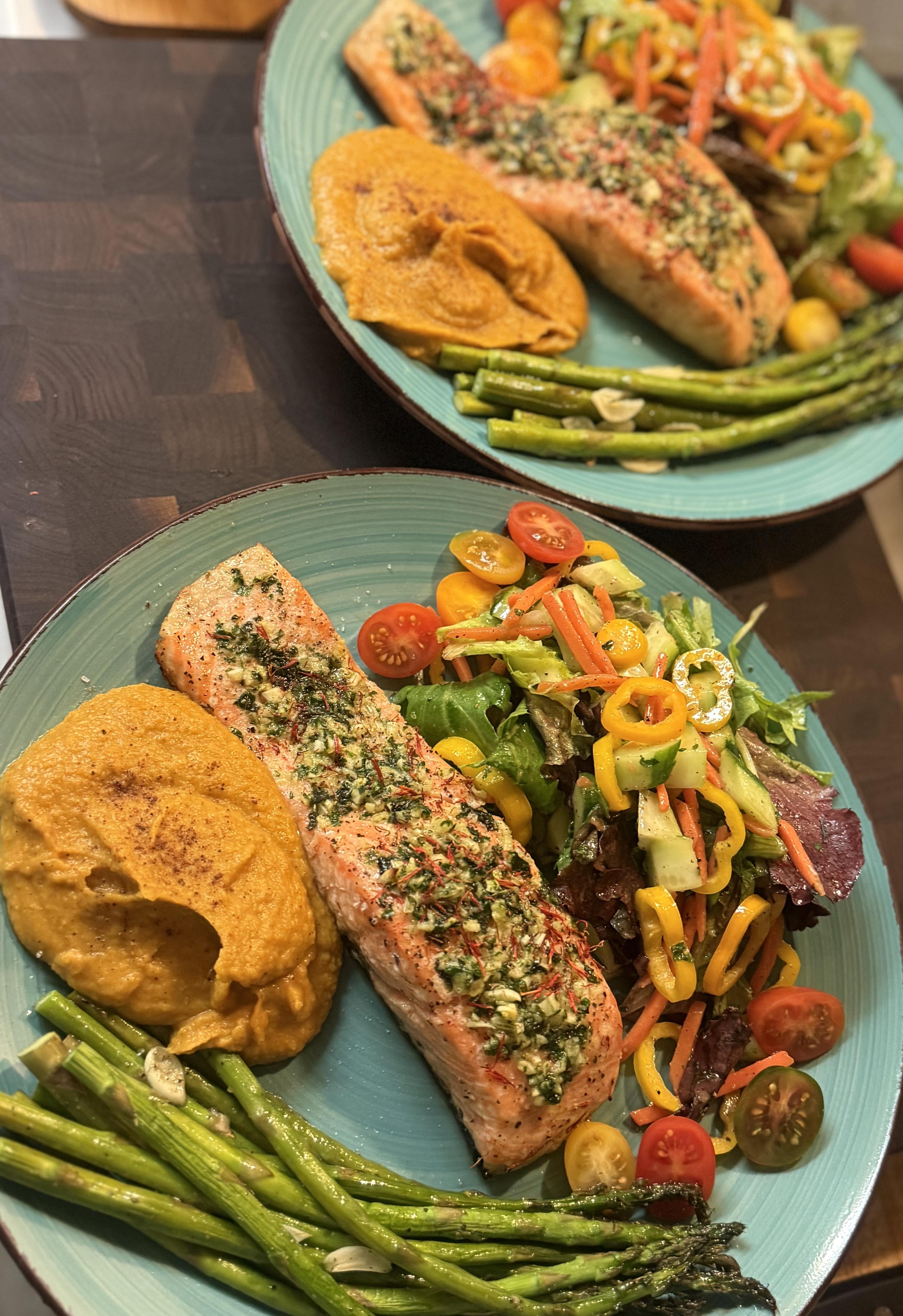 Oven baked salmon (garlic herb onion topped) Sweet potato purée Sautéed asparagus Fresh garden salad by Potential-Coach-7367 Food Porn