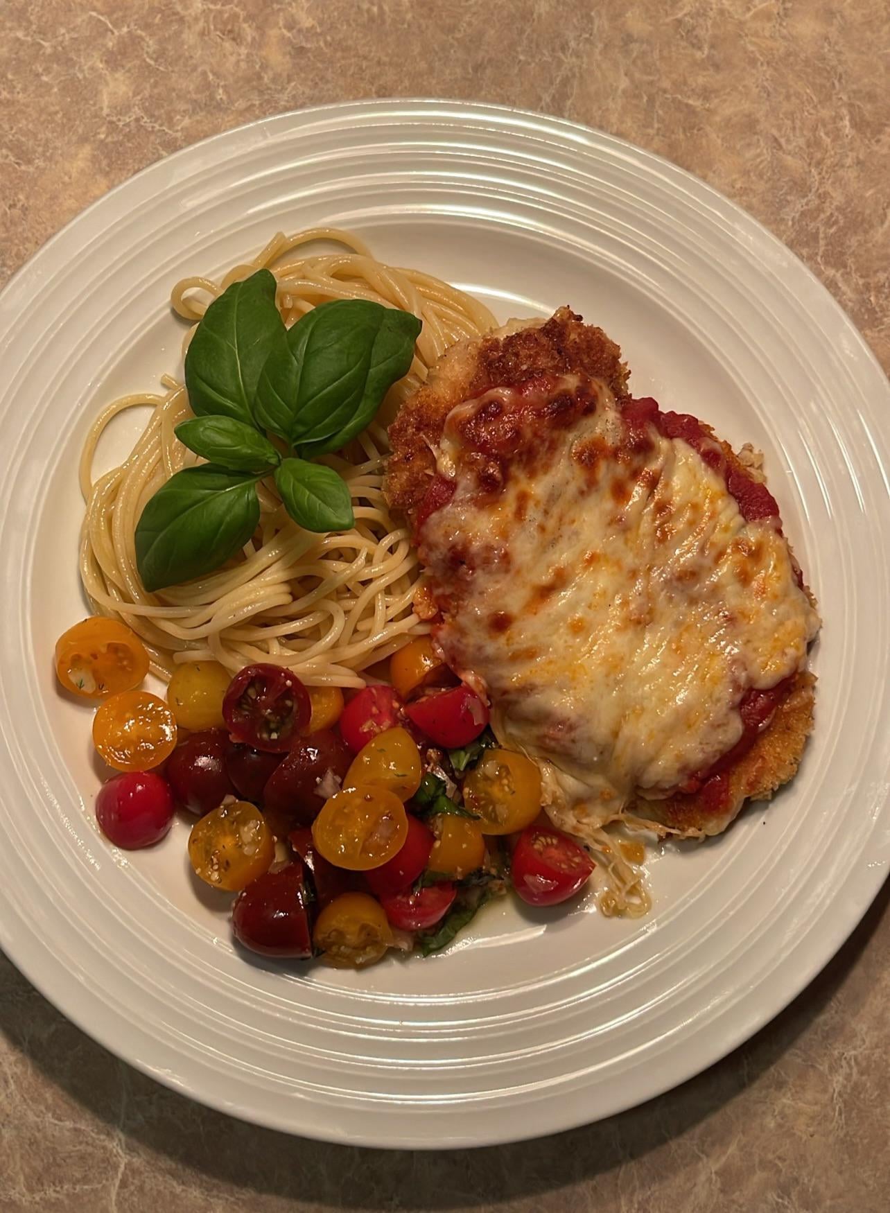 [homemade] Chicken Parmigiana with pasta and olive oil & 12 year white balsamic dressed tomatoes by amandarenee0403 Food
