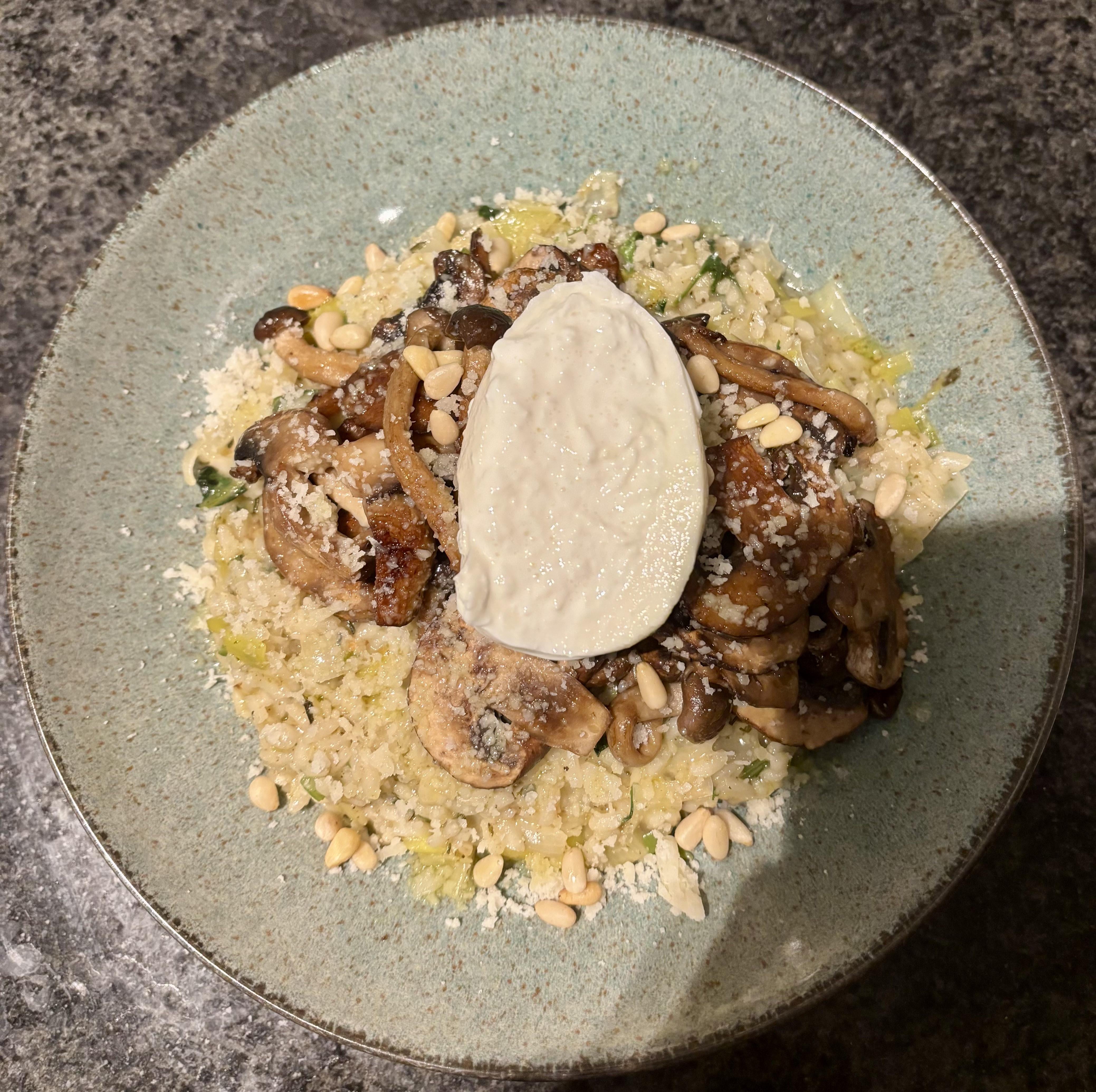 I made a white wine risotto with truffle oil, mushrooms, burrata, pine nuts, pecorino and parmigiano reggiano 🍽️