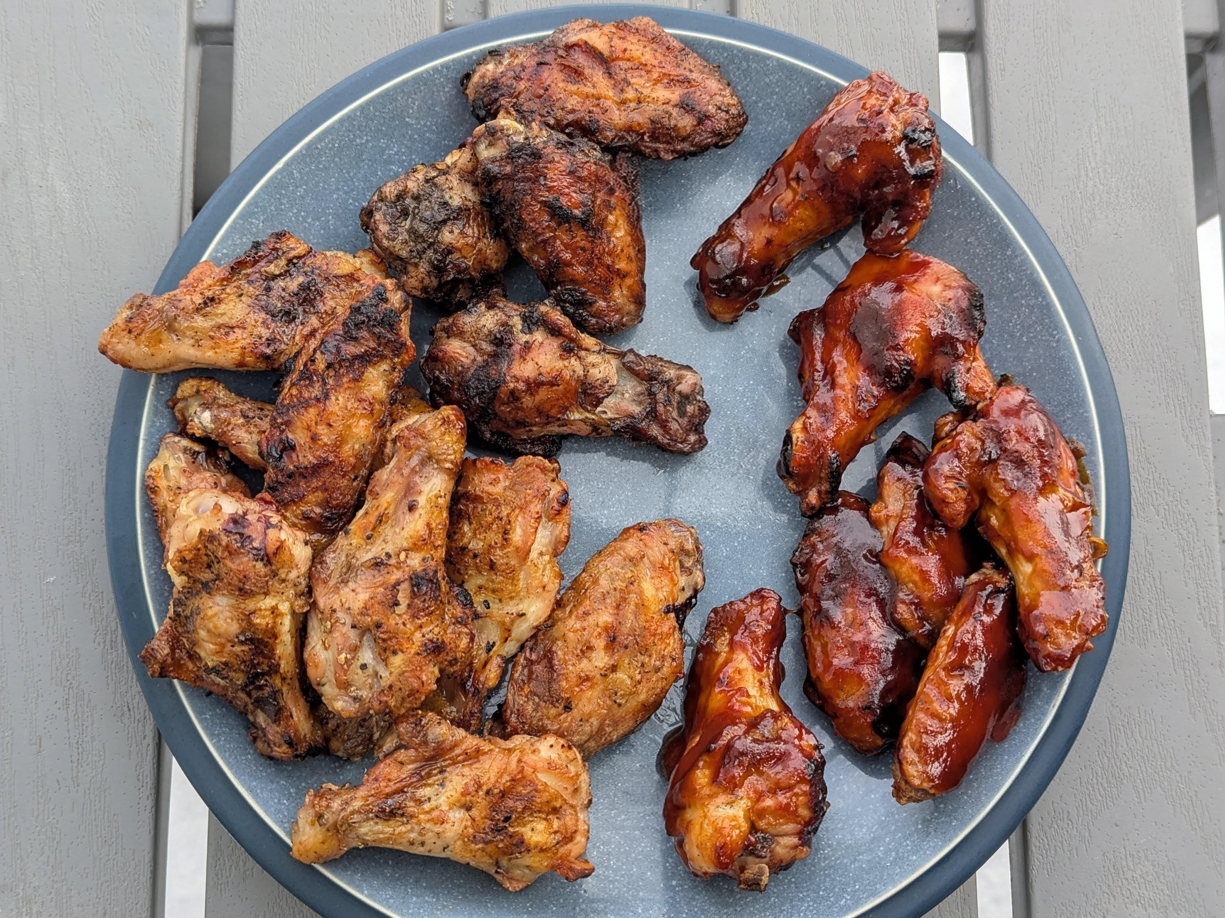 Crispy grilled chicken wings, made salt & pepper, Jamaican Jerk & BBQ styles [OC]
