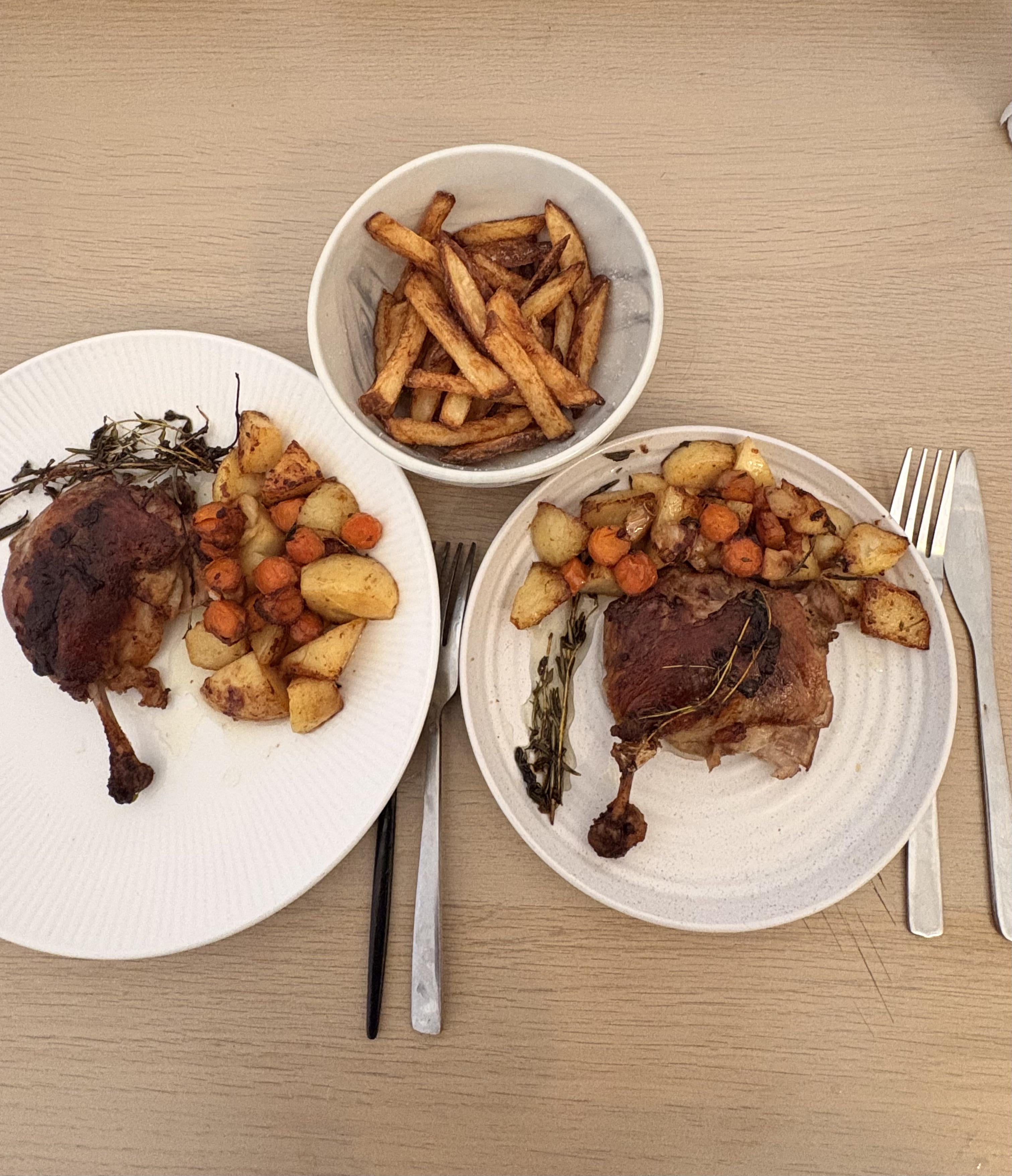 In Australia (where I live), roasted chicken is served for Christmas meals but I cooked something different. Self-made seasoned chips were added as our side meal. It was my first attempt of making duck confit and turned out exceptionally well. My partner gobbled it up within few minutes.