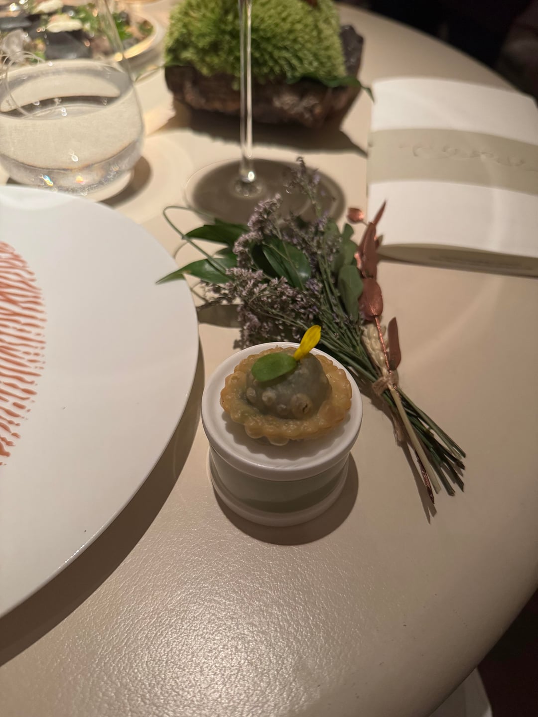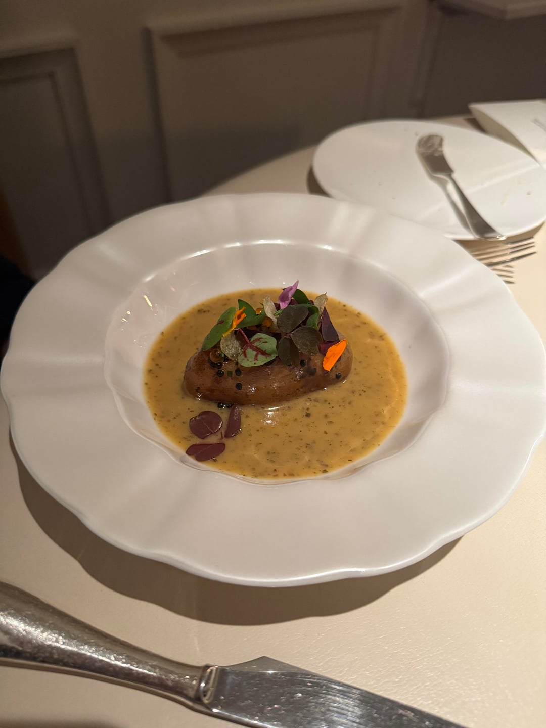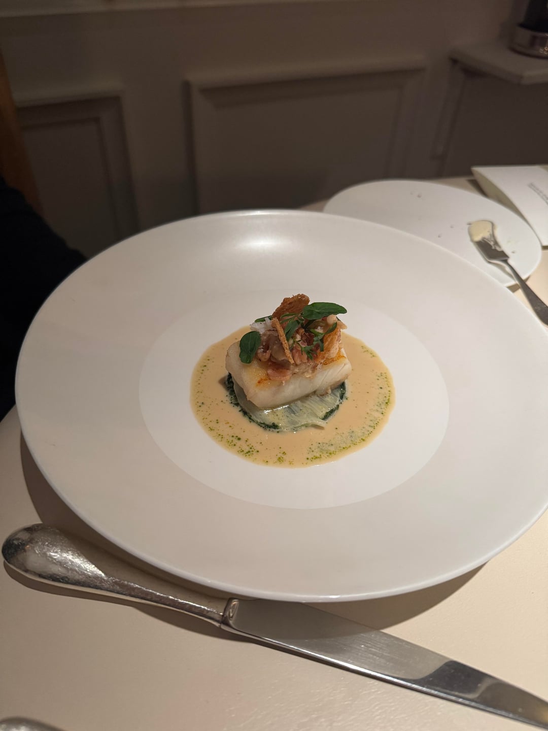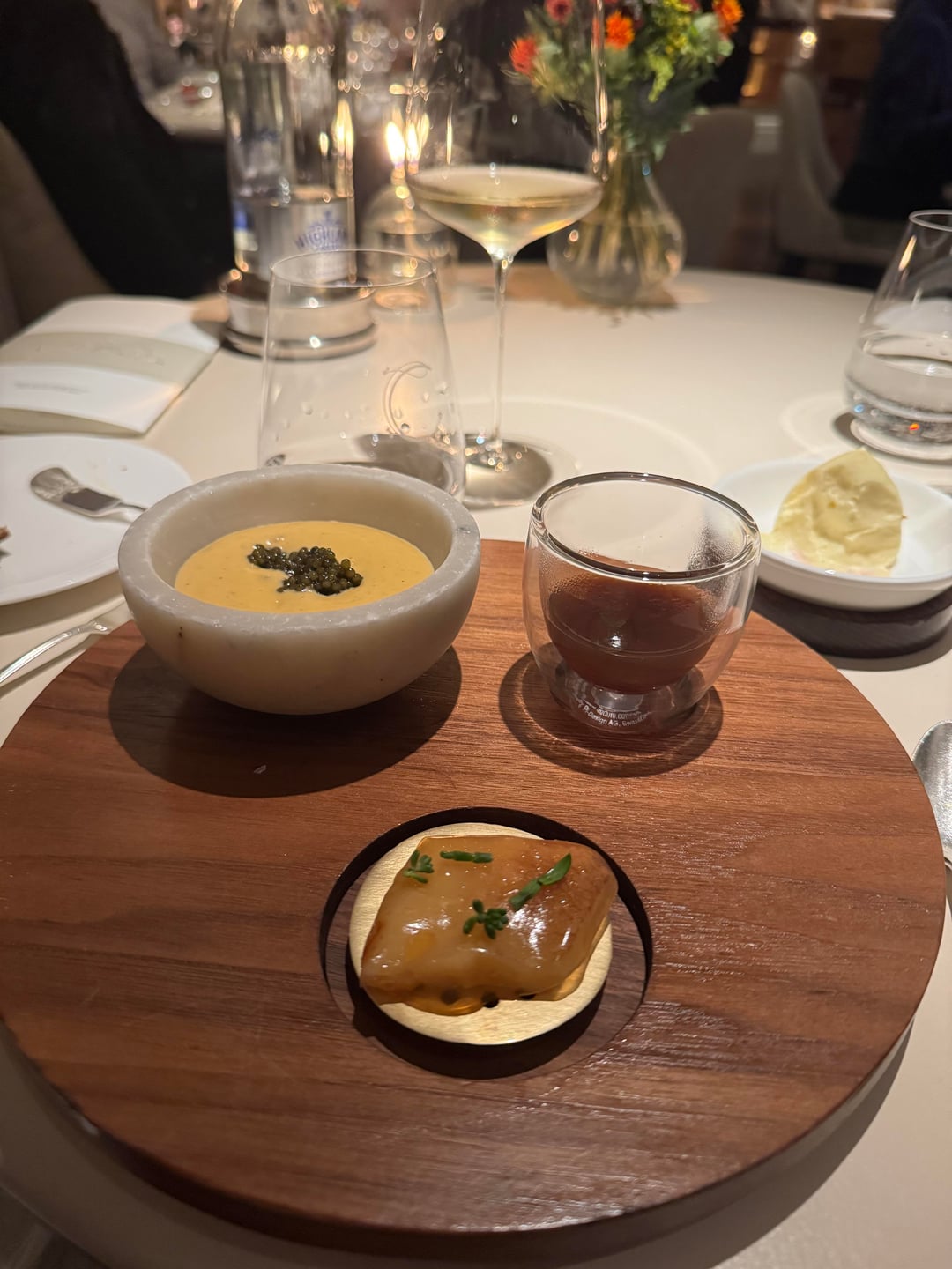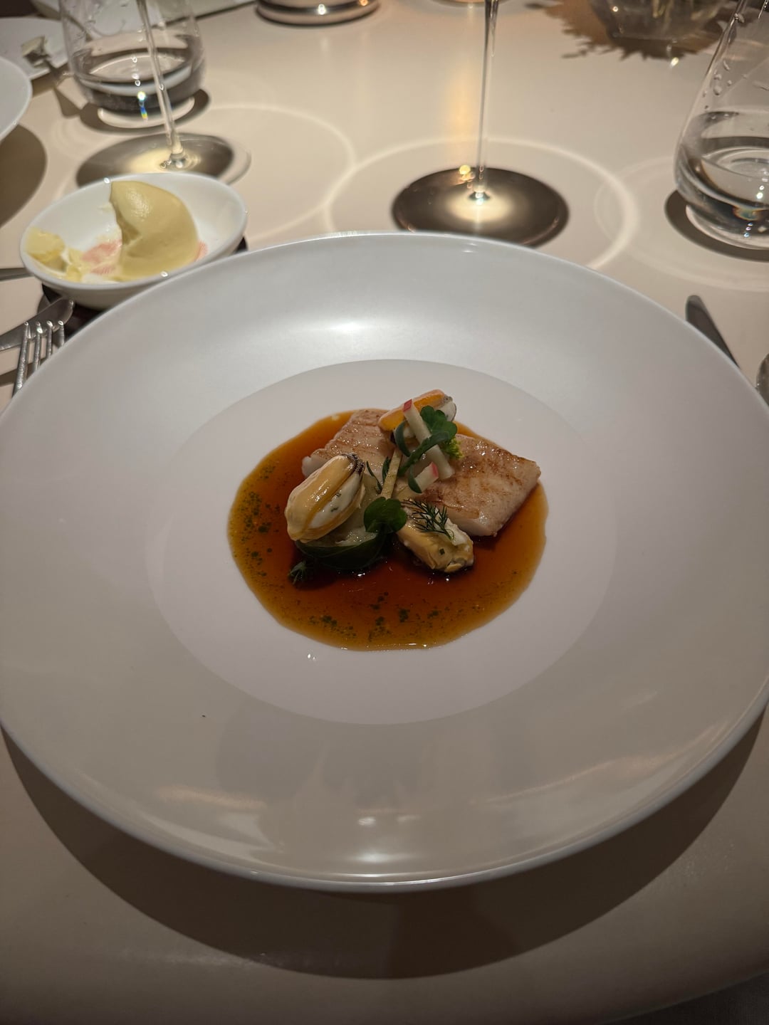 The amuse were the same across both menus: started with a tart with jellied eel, chives, and creme fraiche. Beautiful snap to the tart and light smokiness akin to nova lox. Second one was their “Sunday Roast” taco filled with roast chicken, pommes puree, and thyme. Very interesting bite in how much flavor it packed and how true to the name it tasted. Next was a green vegetable tart I believe consisted of peas. This replaced the mini lobster roll (due to allergies), which looked substantially better. Didn’t stand with the other first bites and felt a bit uninspired. Last was a pumpkin gougere that was almost delicious but slightly ruined by being a bit underdone. The flavor was there but the dough was a bit pasty.