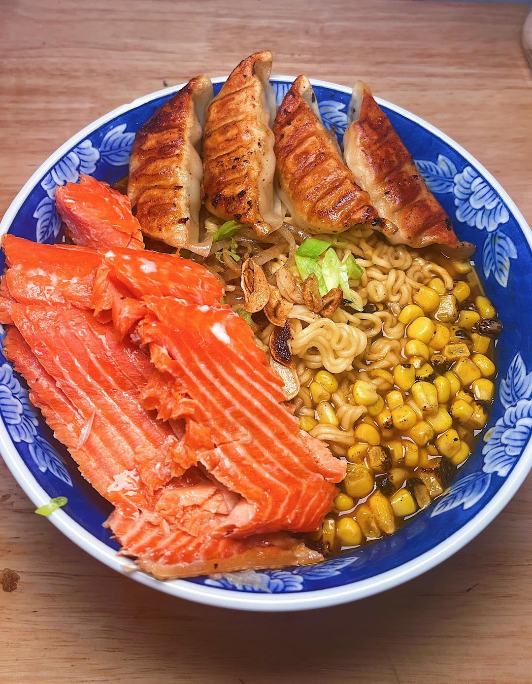 2. Dressed up Shin Ramen. Salmon, corn, & gyoza