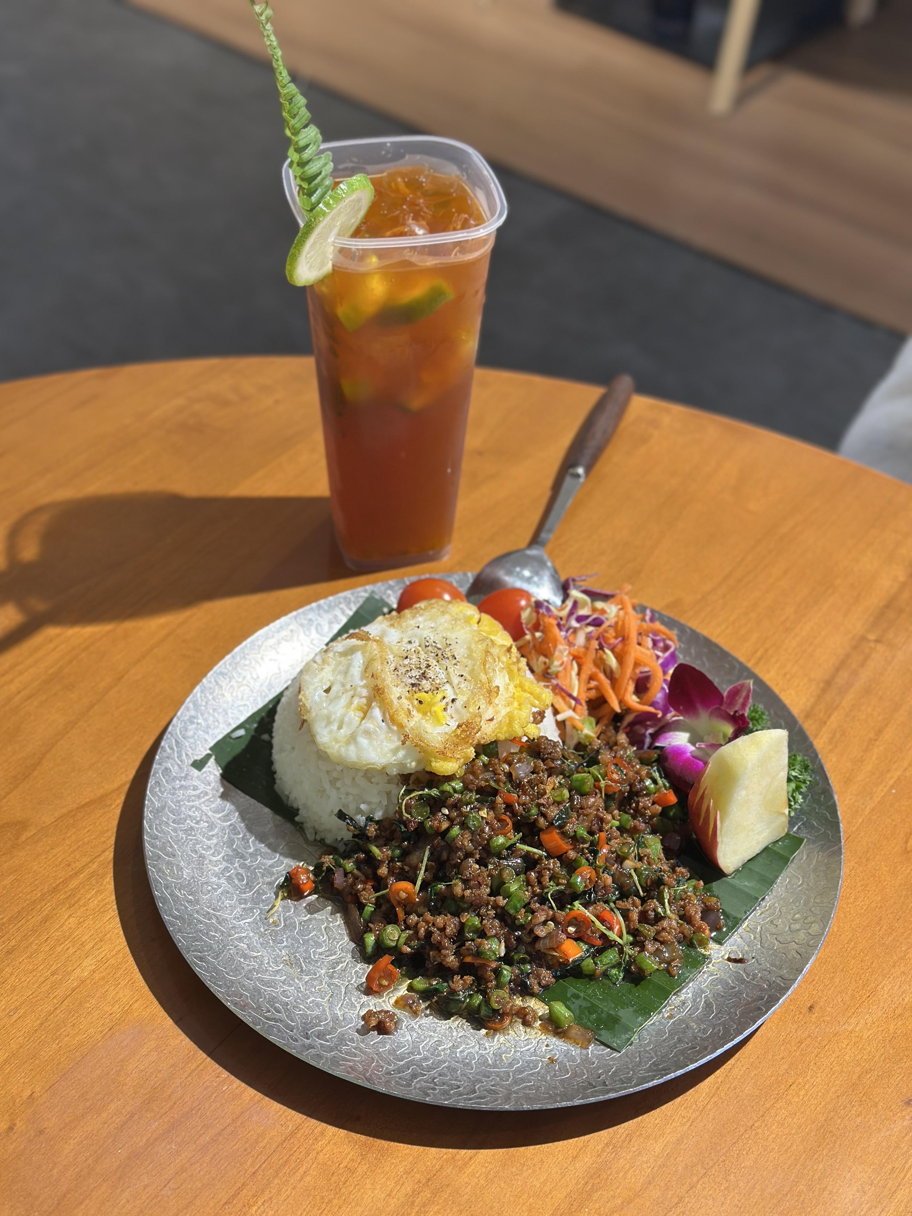 It’s a quick stir-fry made with minced pork, garlic, bird’s eye chilies, fish sauce, and holy basil (กะเพรา), served over jasmine rice and usually topped with a Thai-style fried egg (ไข่ดาว).
