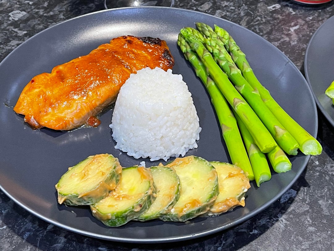 Sticky Asian marinade salmon, sushi rice, fresh asparagus and satay cucumber.simple but hit the spot.washed down with a couple local drops.