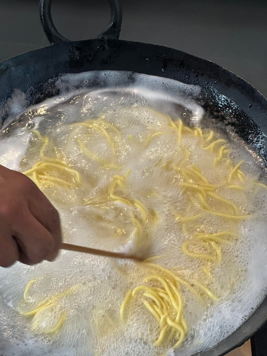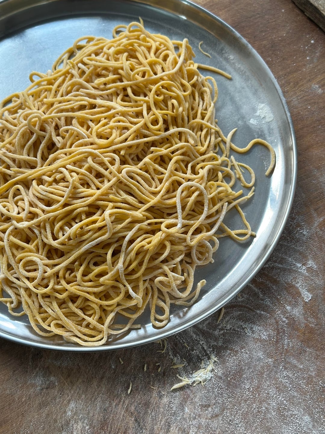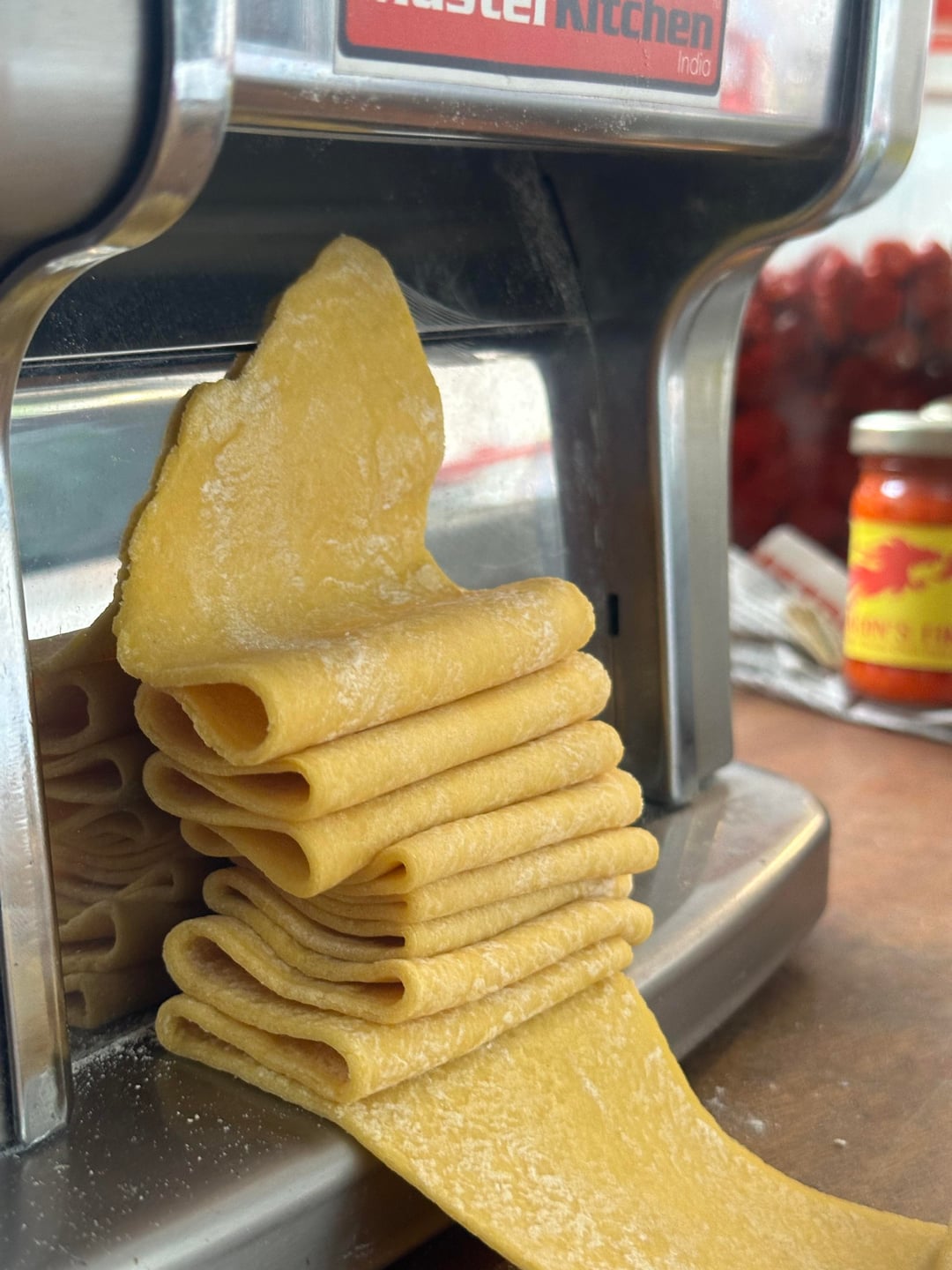 Half kg flour 6 eggs Knead hard Then flatten it out using a pasta maker Boil Ready to eat with different recipes. by raghavpr Food