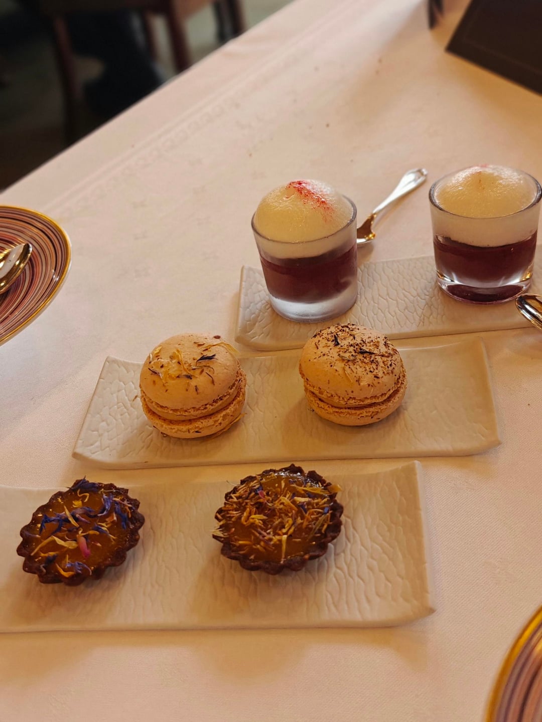 The dessert was a doyenné pear presented in different textures: a chocolate-pear cake with a cannolino, a pear sorbet. I think the only item that I disliked was the poached pear (penultimate picture) since I believe they used some cherry liqueur, which tasted a bit like cough syrup. The meal ended with four petit fours: a rooibos sorbet, a macaron, a passion fruit tartlet, and a warm madeleine (not pictured).