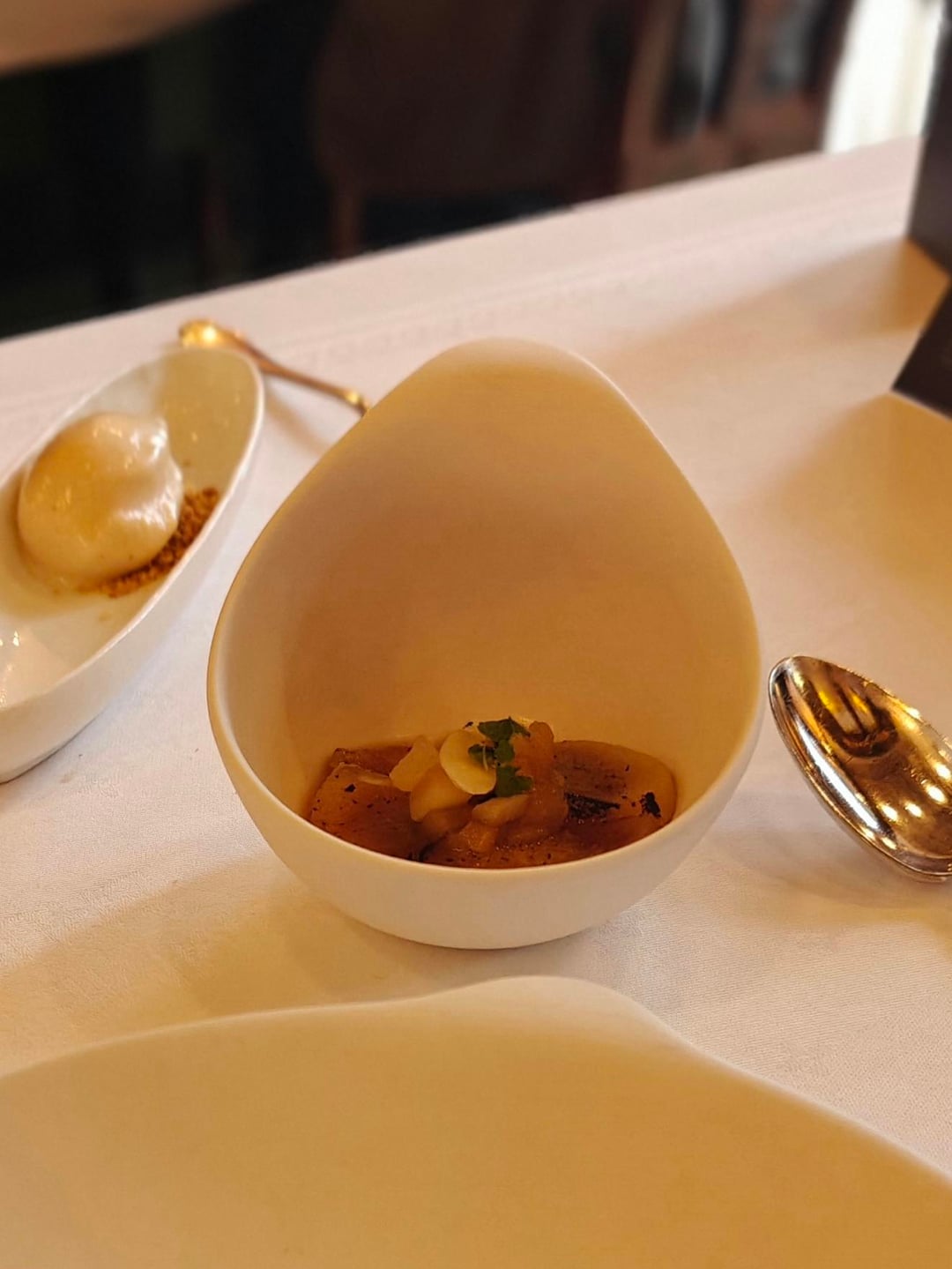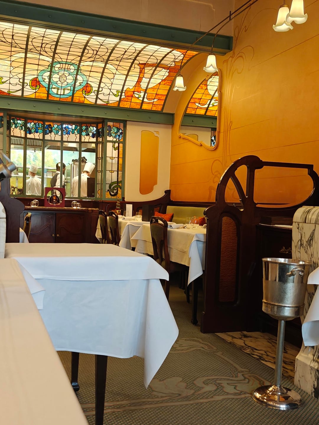 The dining room is decorated in a beautiful art nouveau style and the tables were set up quite close together with benches on one side and chairs on the other. I went for the five-course menu (€185) for lunch. It contained four amuses: