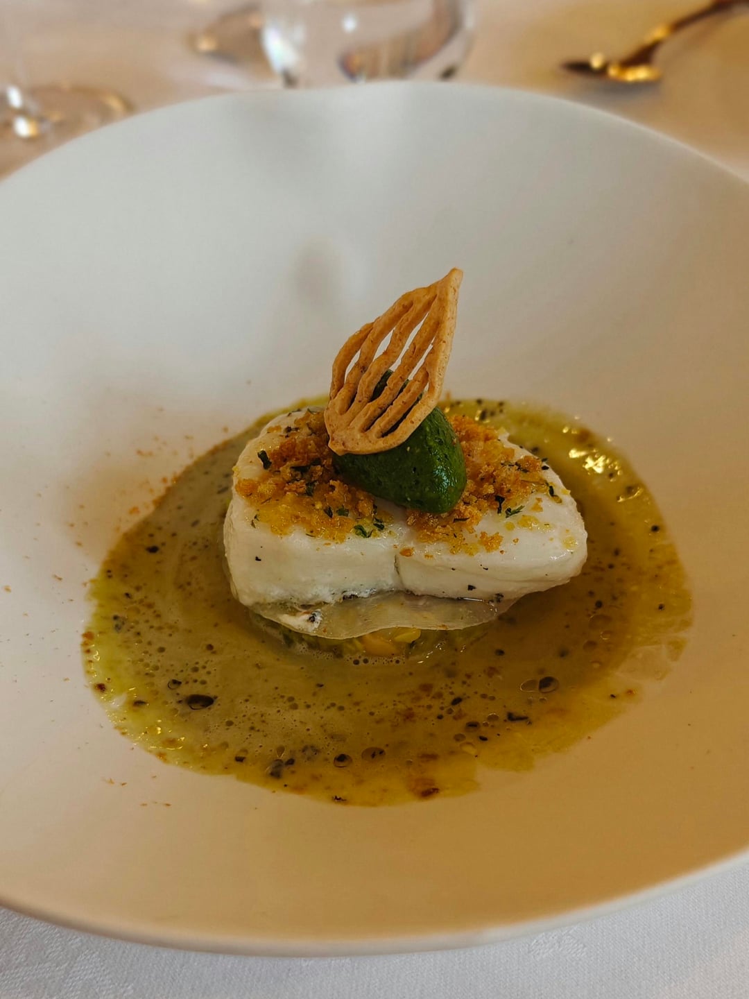 • Leeks in a beurre blanc split with herb oil