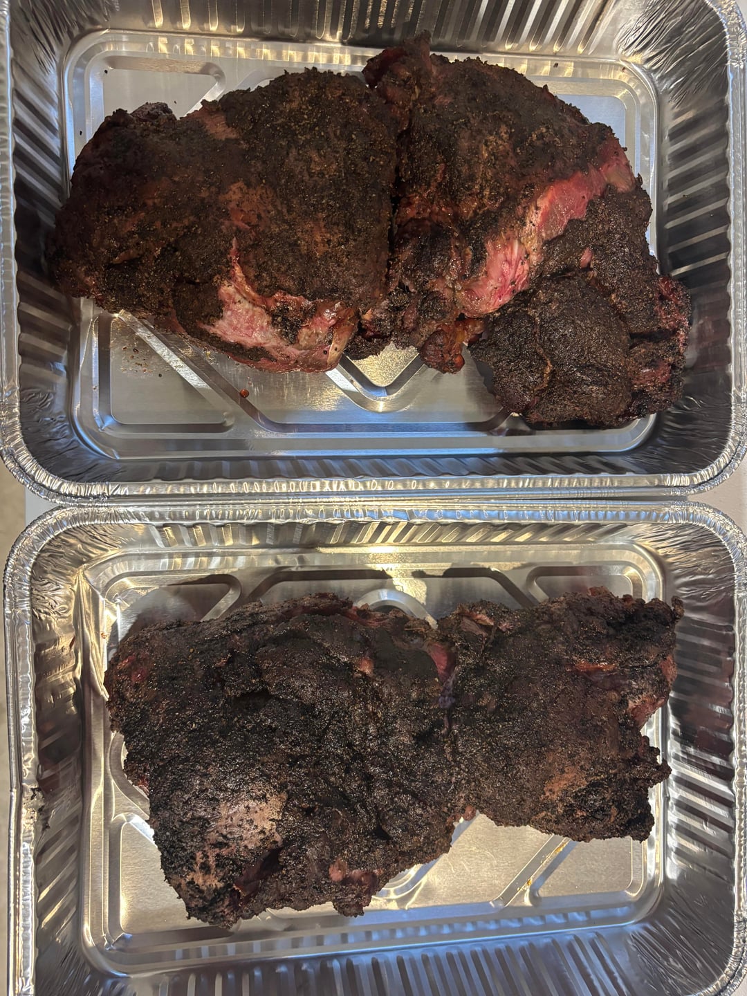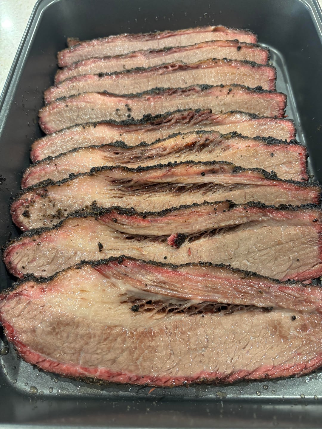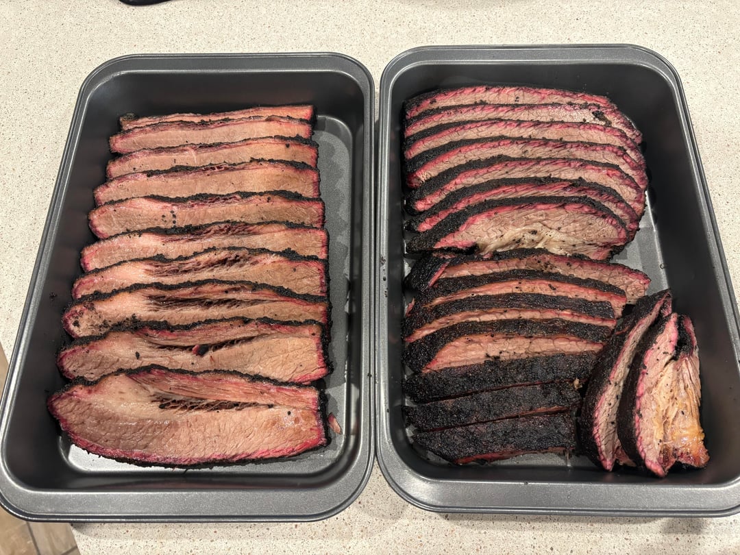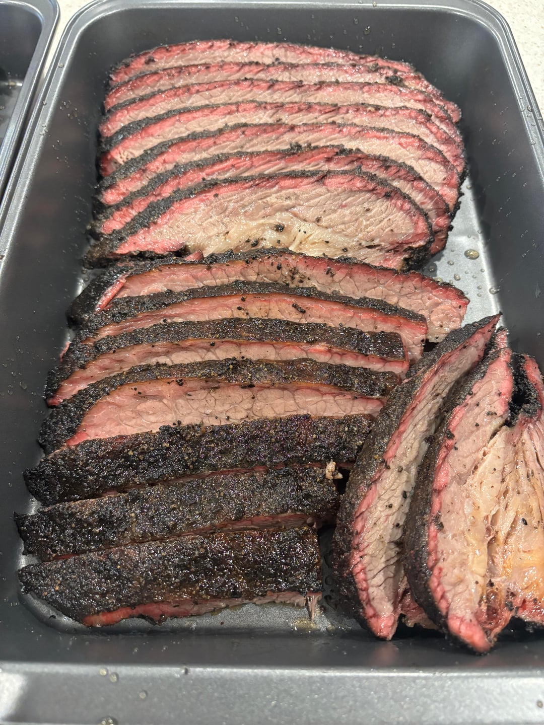Wrapped with butcher paper when pretty. Pulled for 2 hour hot hold once temp hits 190. Rested on counter till easy to handle. Sliced the lean side until reaching the point. Then separated lean and point, flipped remaining lean so the bark side is up and sliced, rotated point and sliced. Plated the lean in one container and the moist lean and fatty slices in the second container.