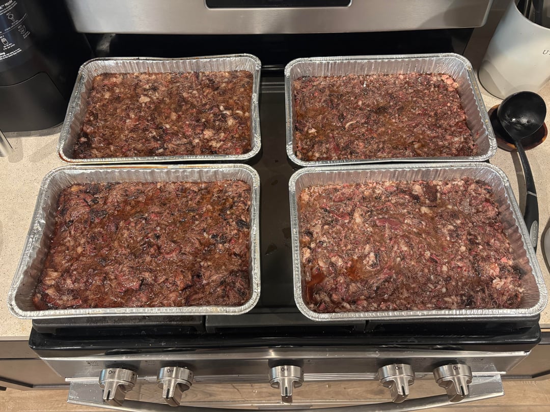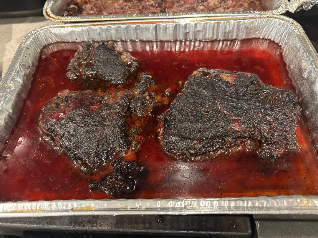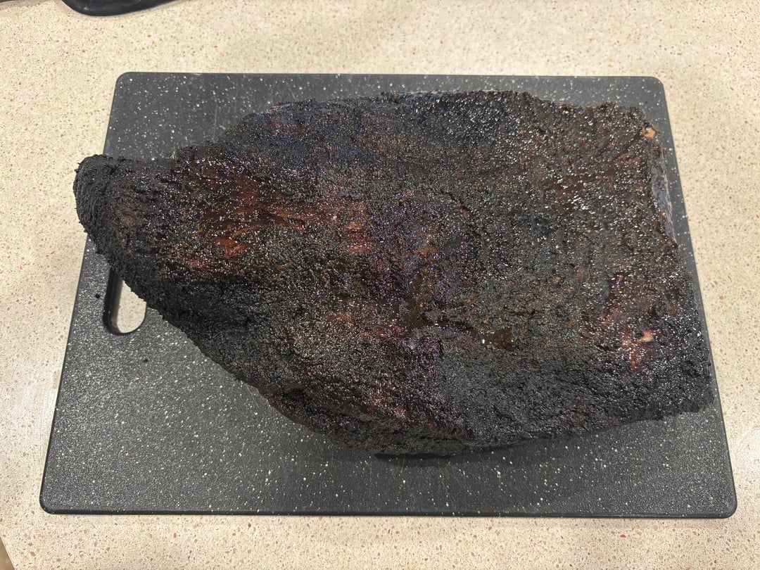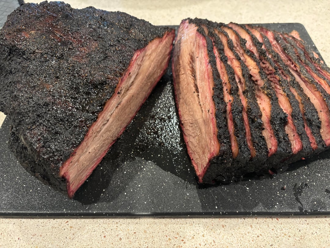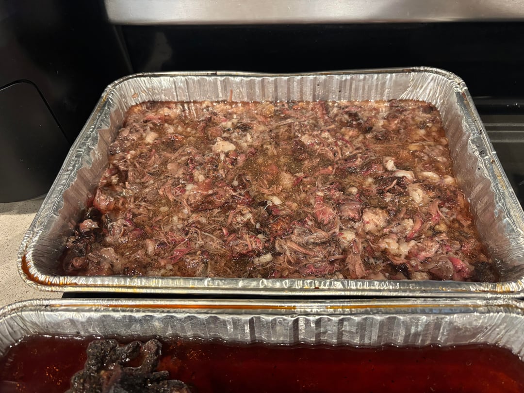 Wrapped with butcher paper when pretty. Pulled for 2 hour hot hold once temp hits 190. Rested on counter till easy to handle. Sliced the lean side until reaching the point. Then separated lean and point, flipped remaining lean so the bark side is up and sliced, rotated point and sliced. Plated the lean in one container and the moist lean and fatty slices in the second container.