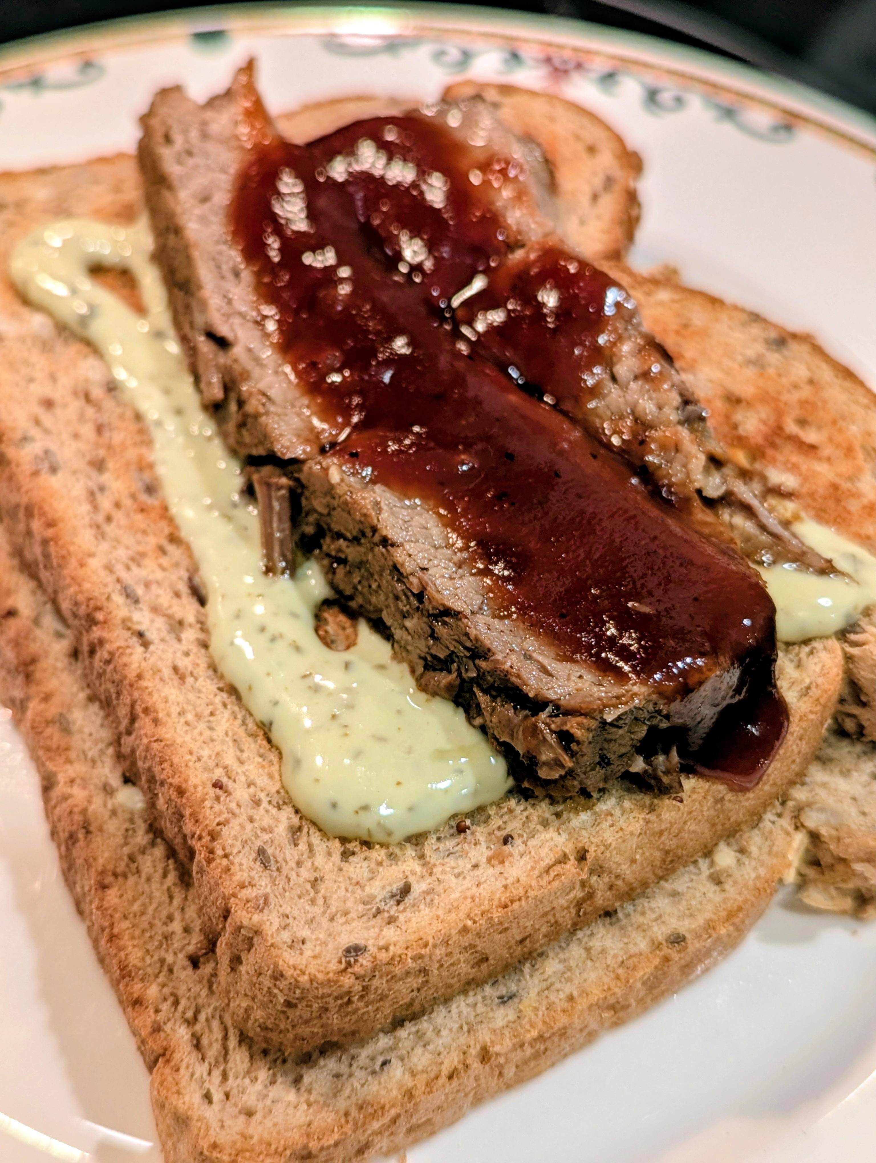 Toast, brisket, pesto aioli, Sweet Baby Ray's Hickory & Brown Sugar Barbecue Sauce. Sweet, juicy and delicious!