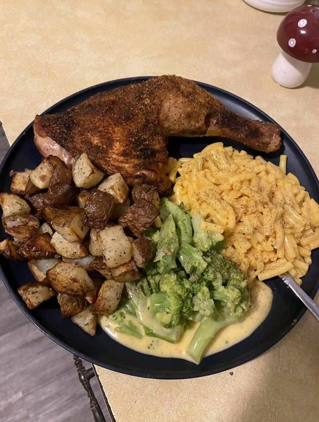 Pork chop, mac and cheese, and roasted potatoes