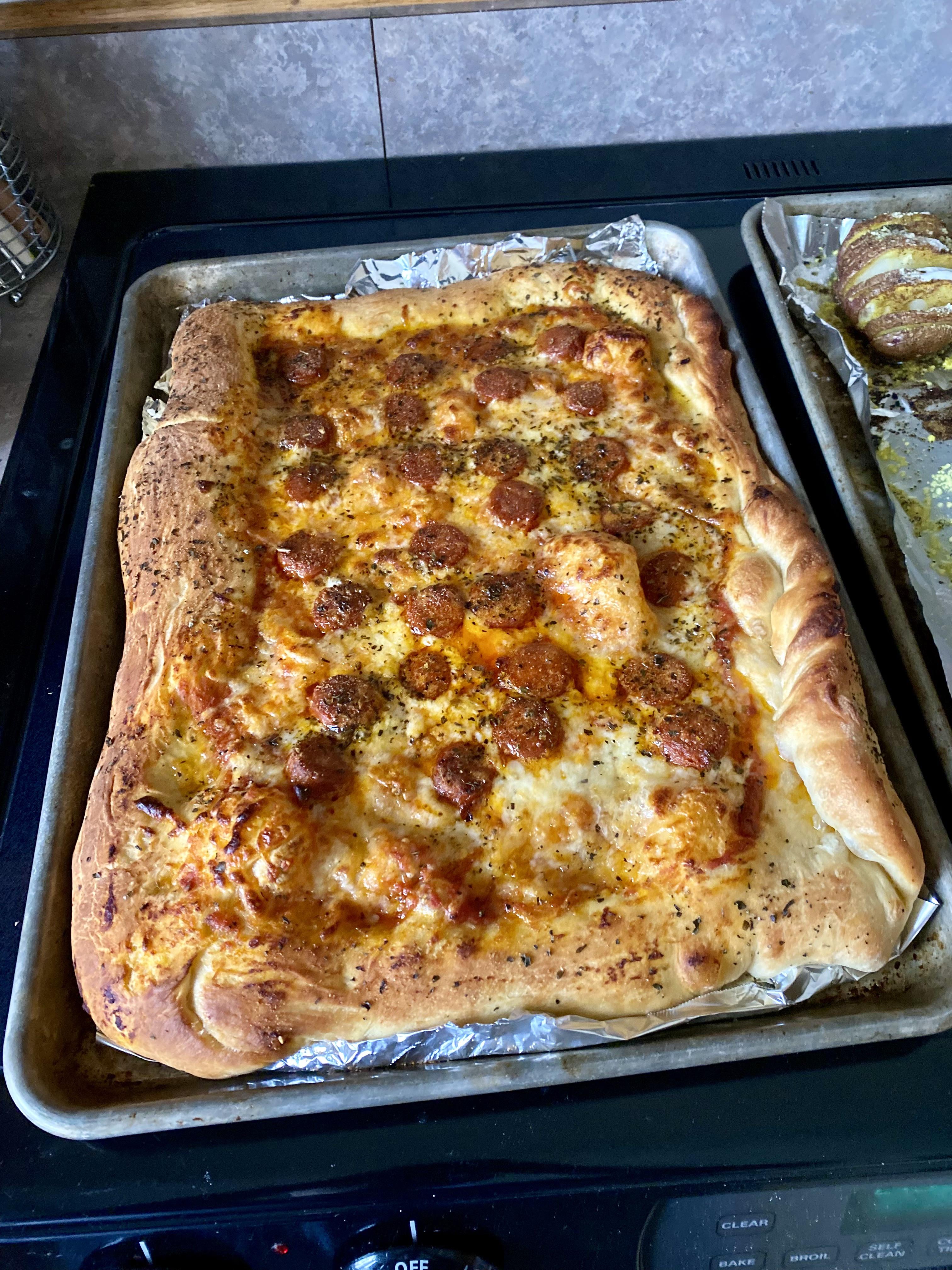 Homemade kielbasa mozzarella and vodka blush sauce pizza. Came out beautiful