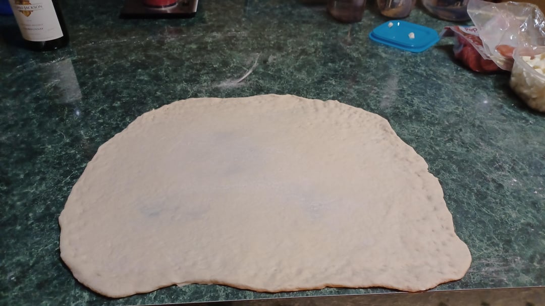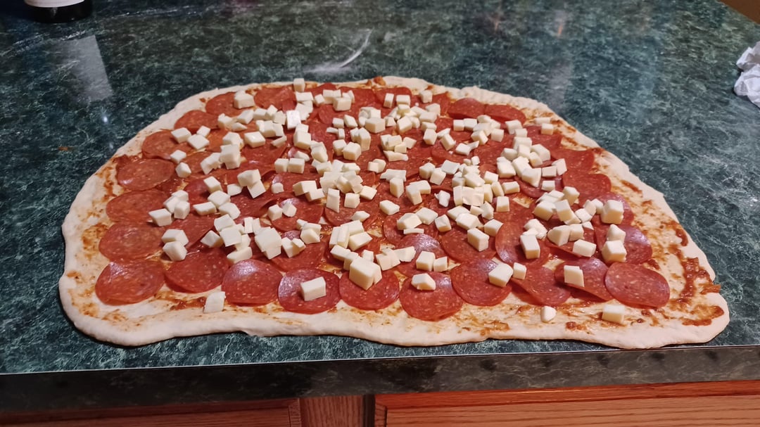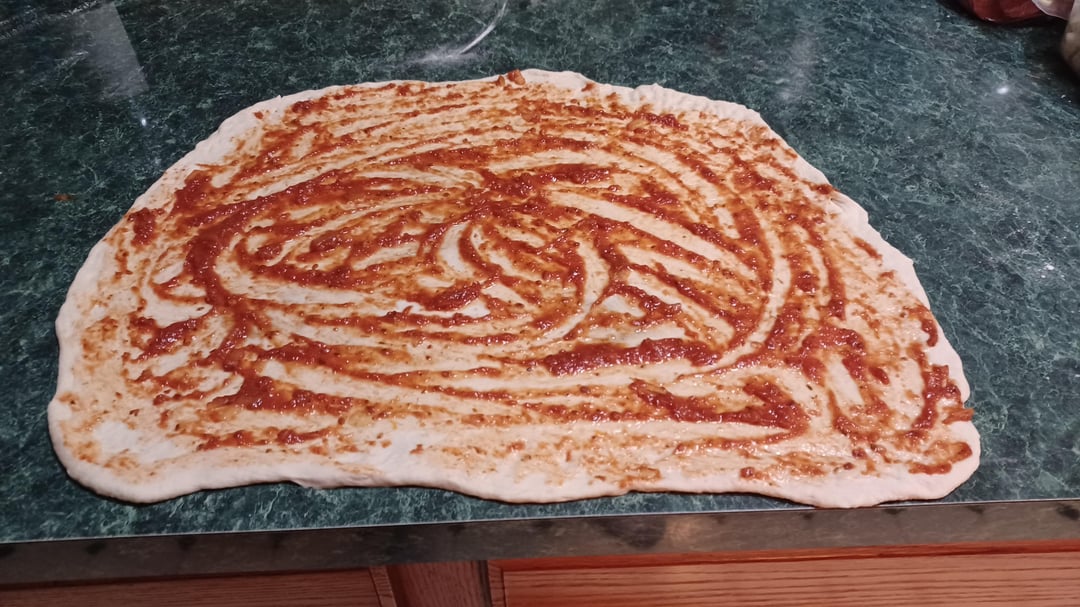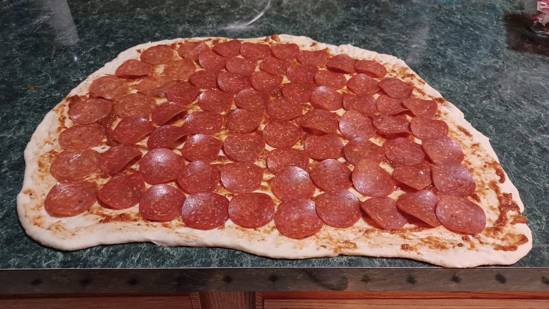 Formed the roll using a wine bottle, flour, and hands. Spread the sauce with a spoon. Layered the pepperoni and cheese. Rolled it up.
