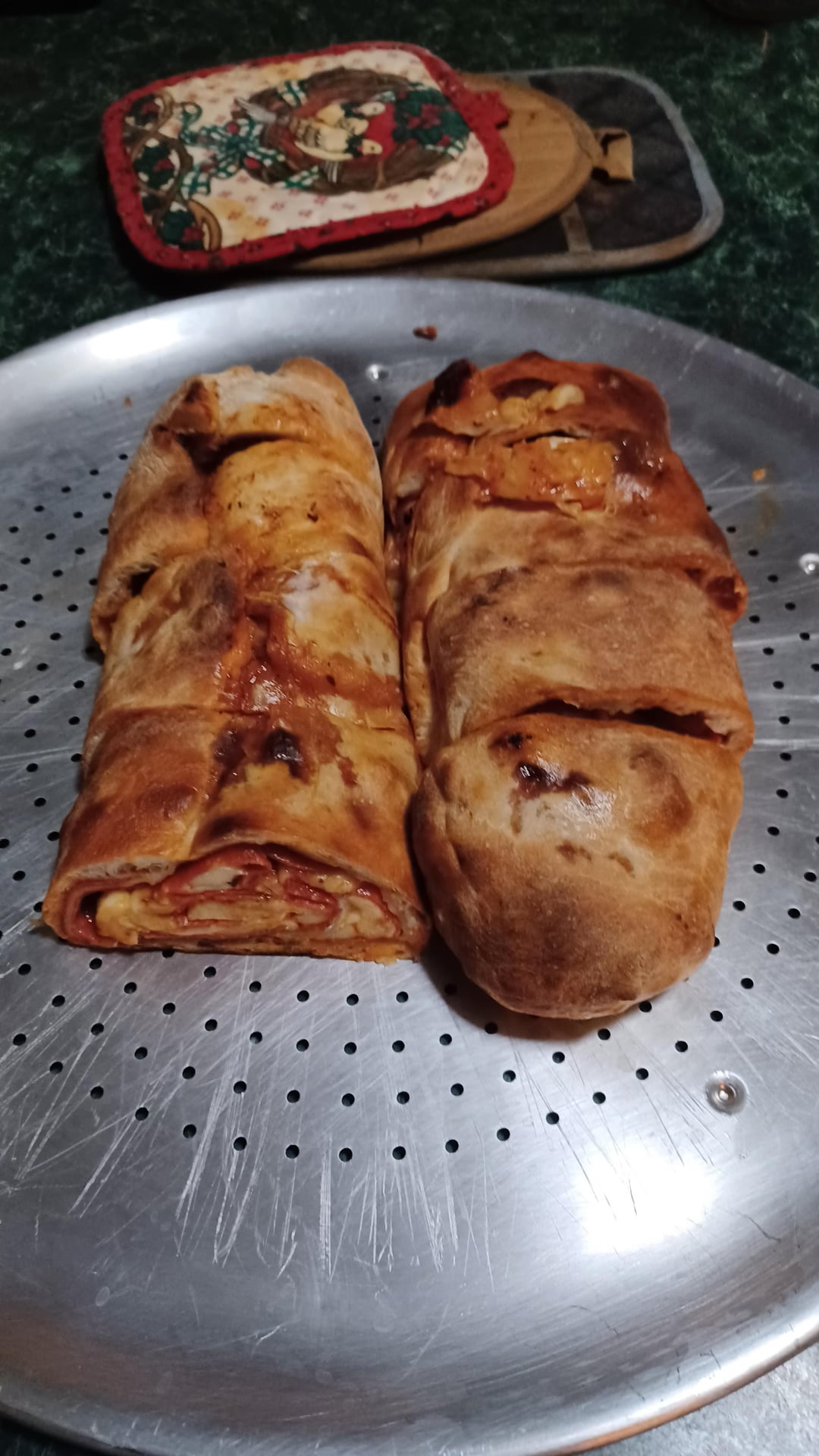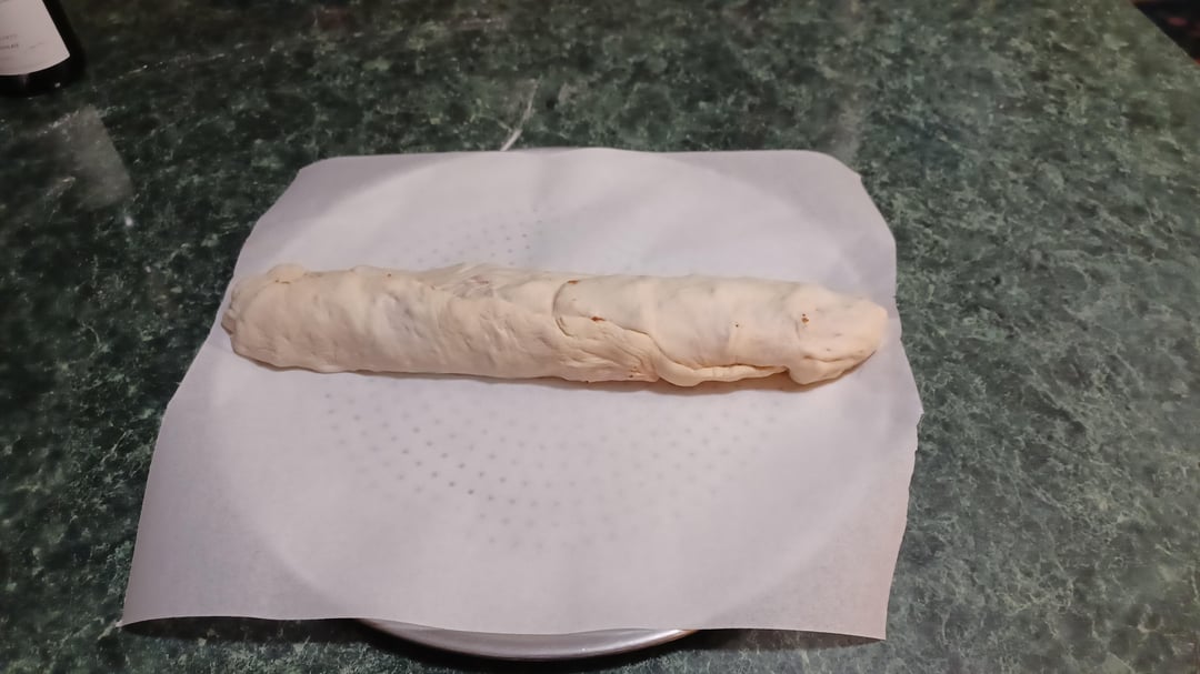 Put on a pizza pan with a sheet of parchment. Baked 15 minutes. Let it cool some and sliced after removing the parchment. Hope you enjoy! Merry Christmas and Happy Holidays!