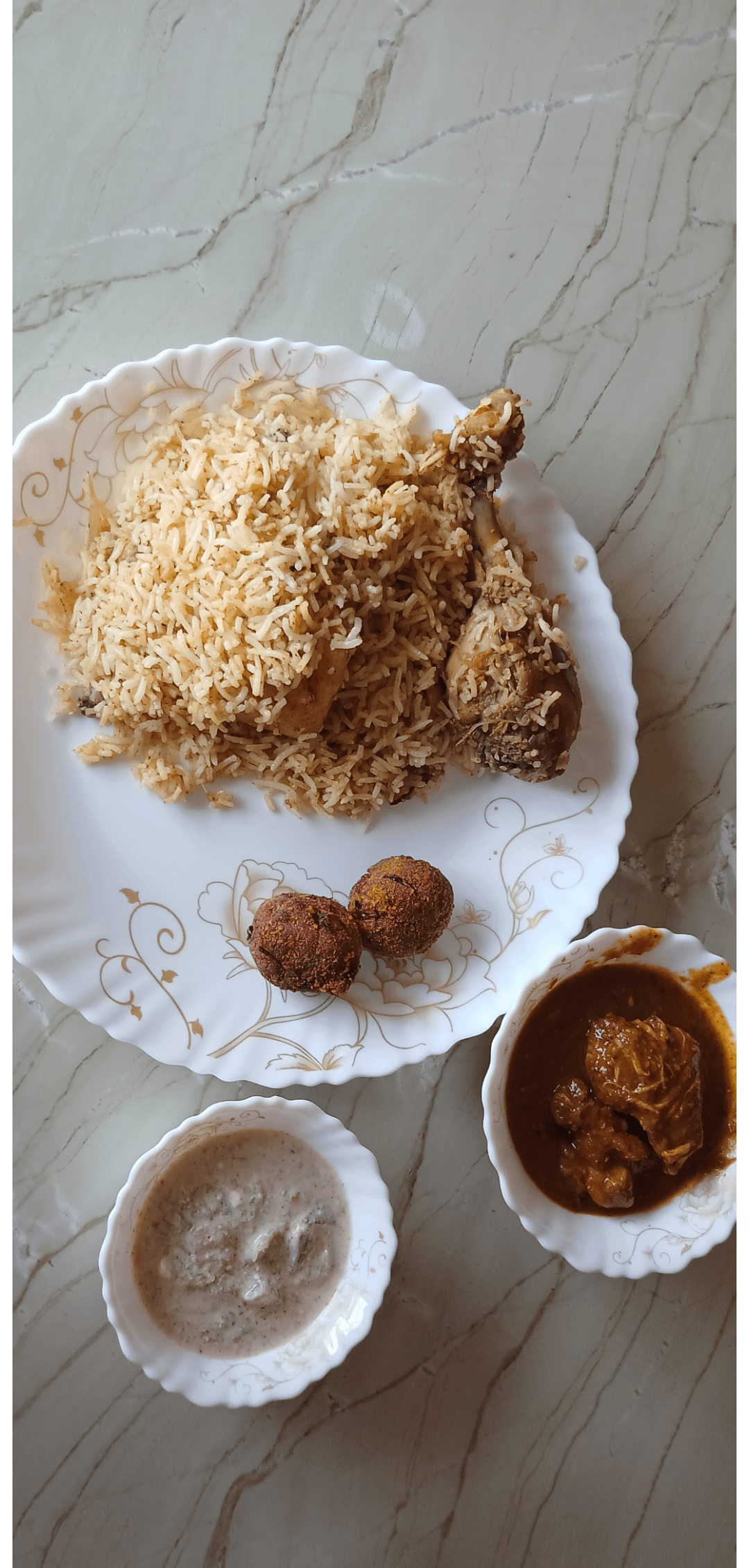 [Homemade] chicken Biryani, mutton curry, crispy fish balls and raita