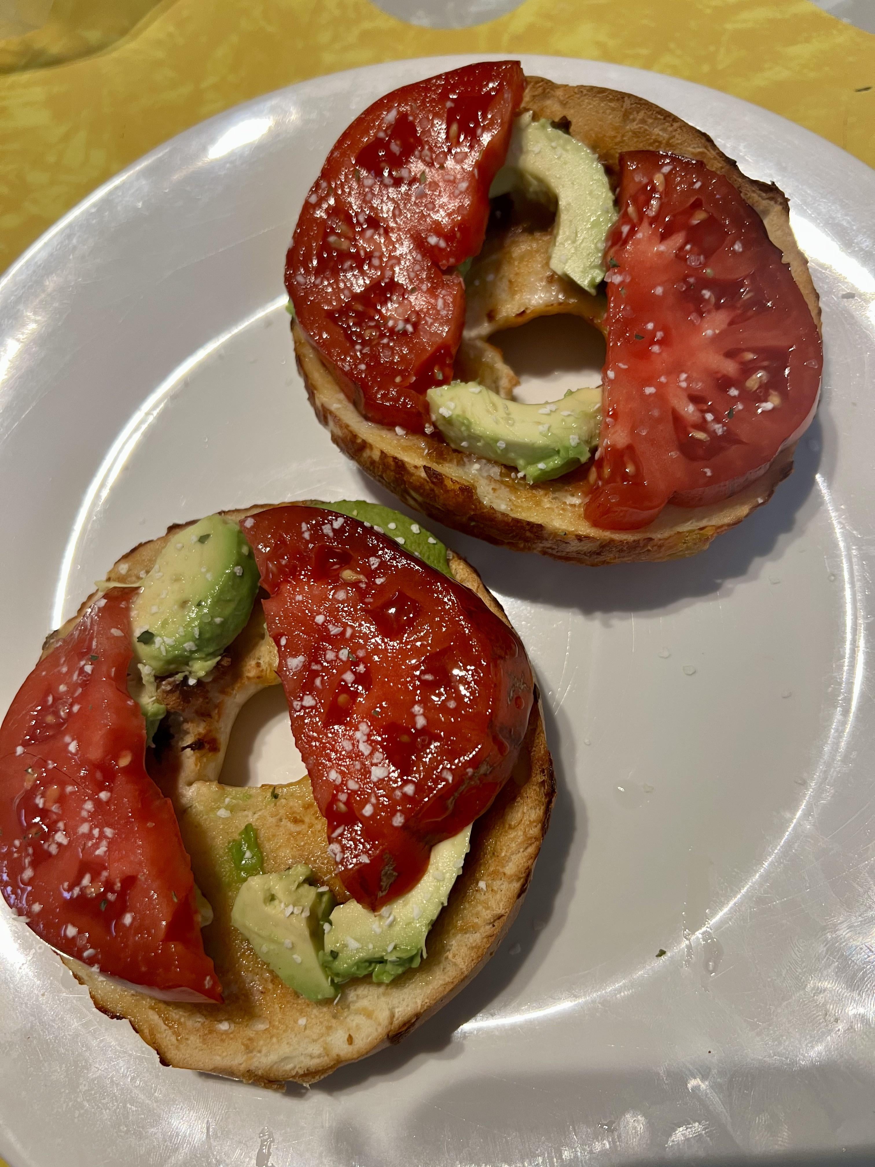 Buttered toasted asiago bagel with avocado and heirloom tomato. Sprinkled with garlic salt. by jrrhea Food Porn