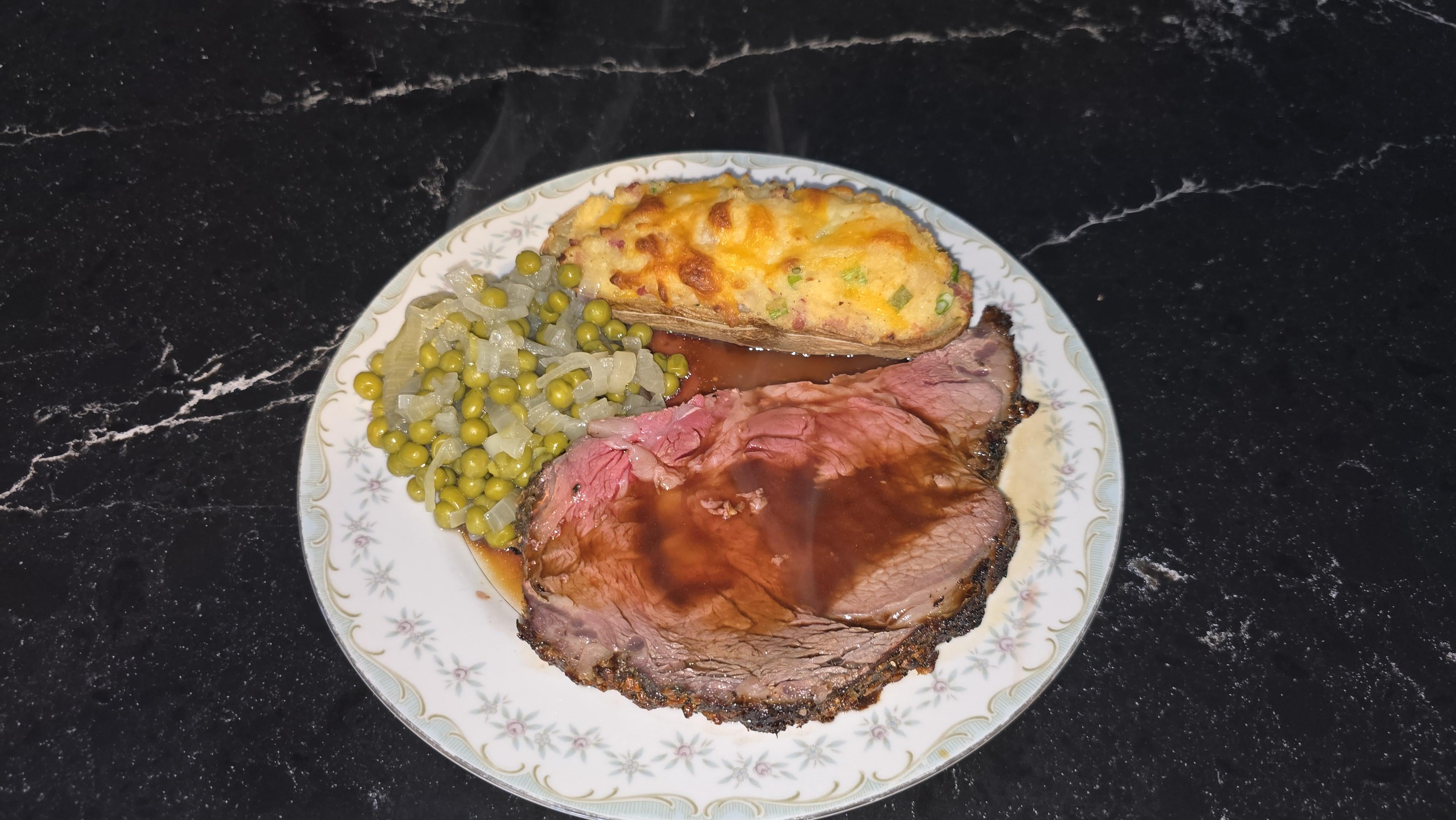 Standard fare I make at my house, with peas and onions (a childhood favorite) and loaded twice baked potato. by The_NewDeal1 Food Porn