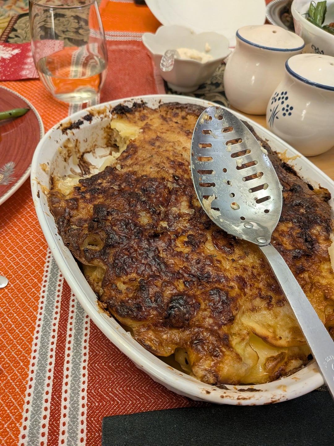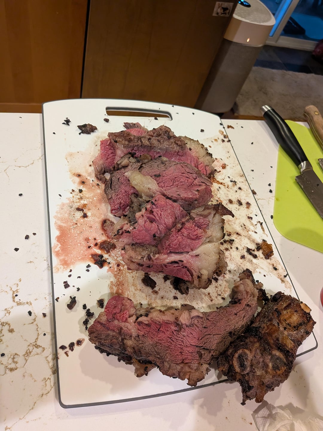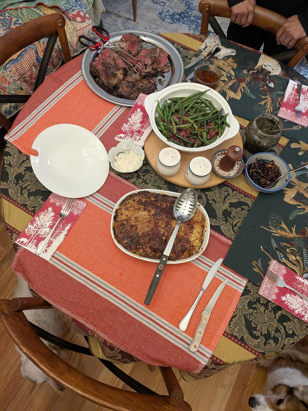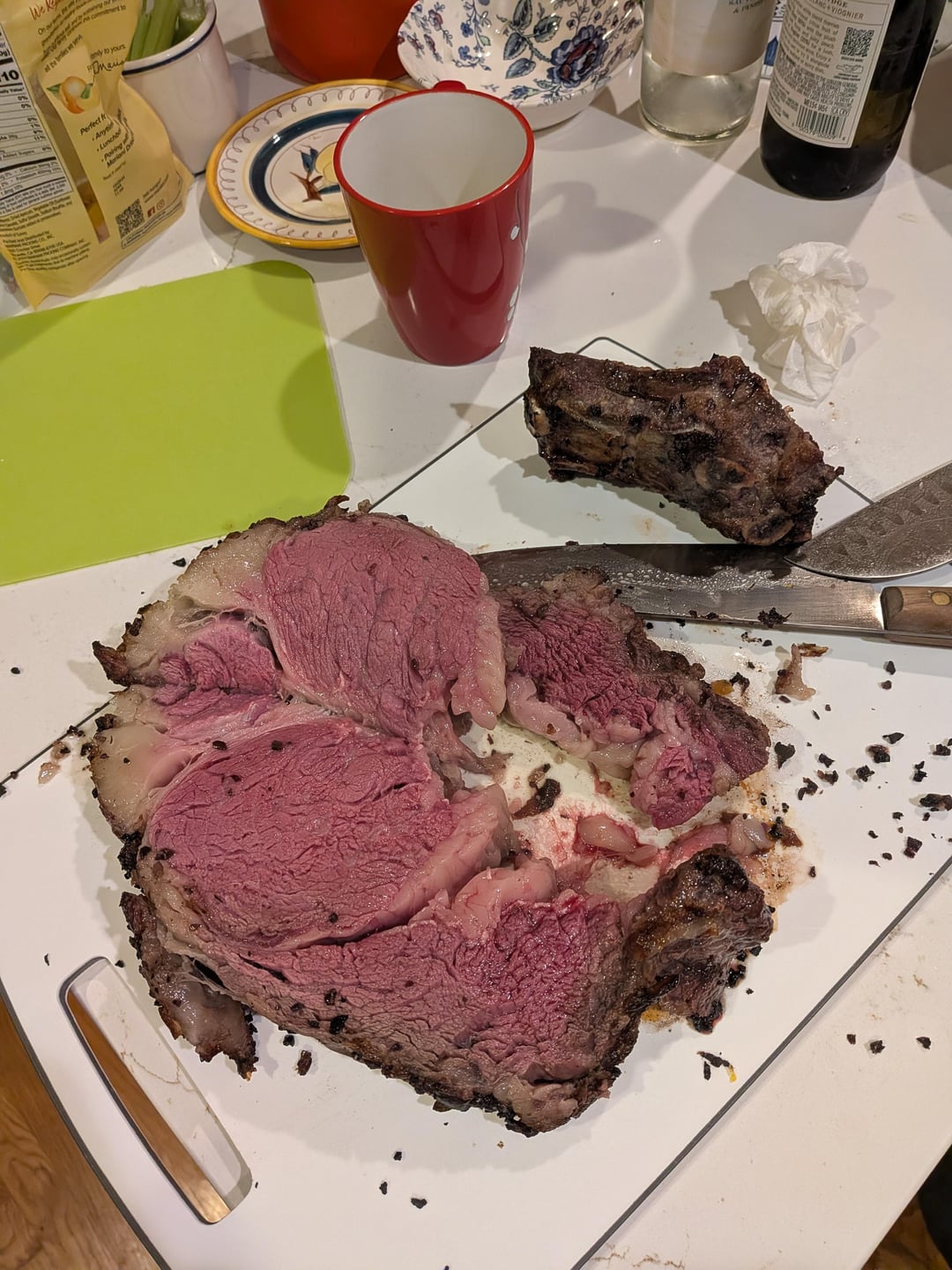 ~3+lb prime rib, some scalloped potatoes, and a green bean/cranberry/bacon/goat cheese dish with sauces and such on the side. Prime rib turned out perfect, but the cuts were a disaster because the parents don’t keep sharp knives. At least I know what services I’m getting as a gift next time!