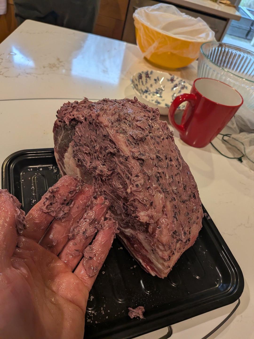 Slathered a red wine/shallot/herb butter all over the rib while roasting it.