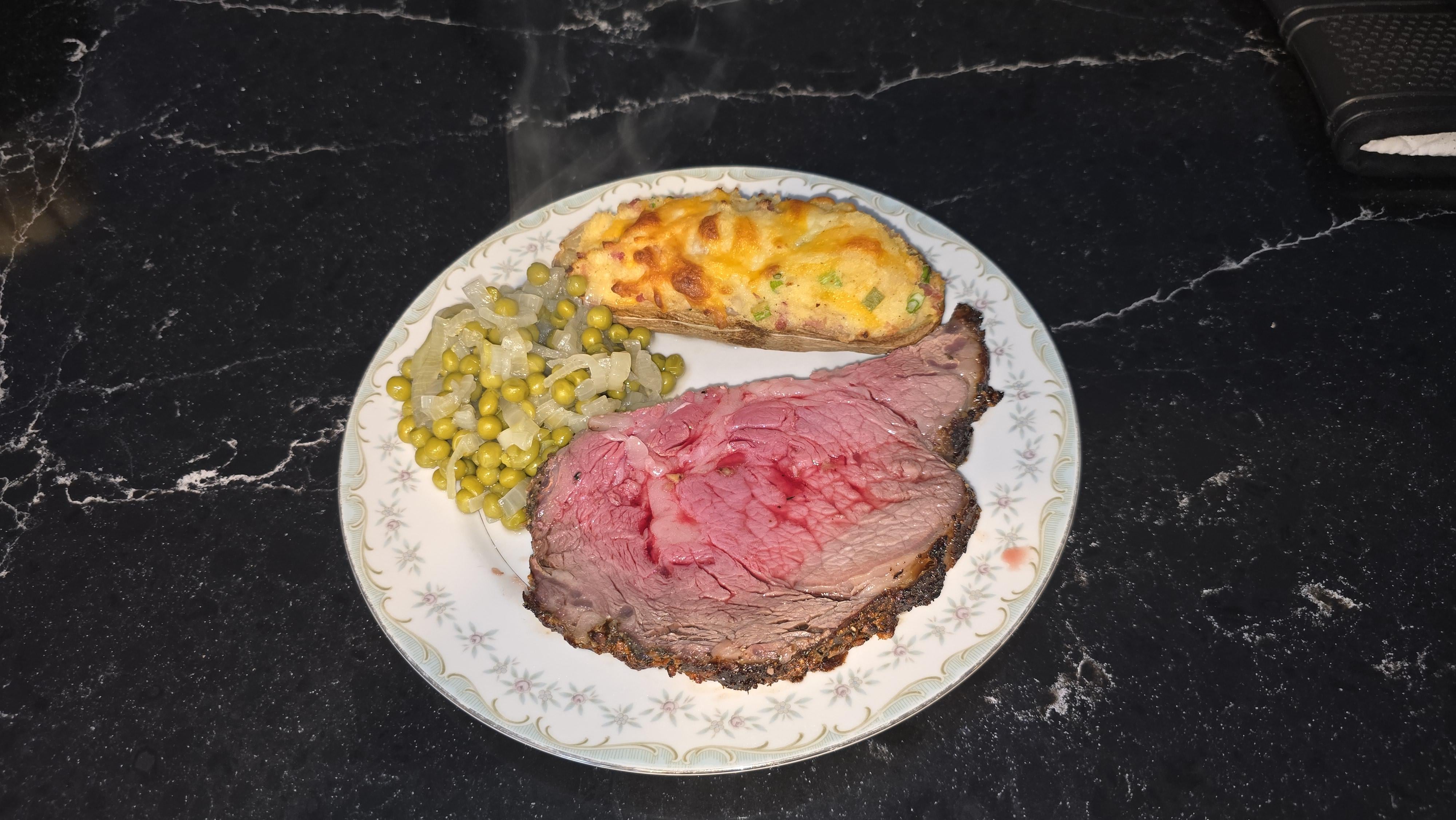 Med rare perfection, my favorite childhood side, peas and onions and tried my hand at loaded twice baked potato. Delicious. Half the day to make and 20 minutes to devour. by The_NewDeal1 Food Porn
